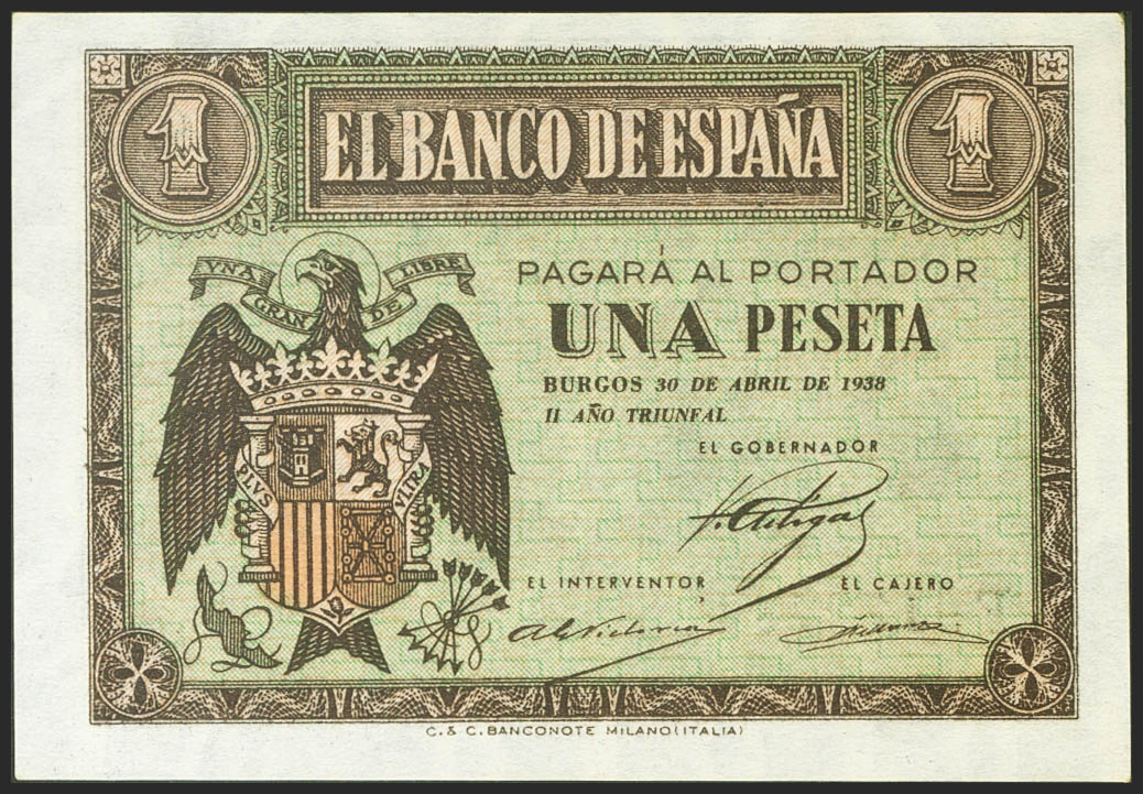 English 1 Peseta. April 30, 1938. Series F. (Edifil 2021: 428a). Original sizing. Uncirculated.