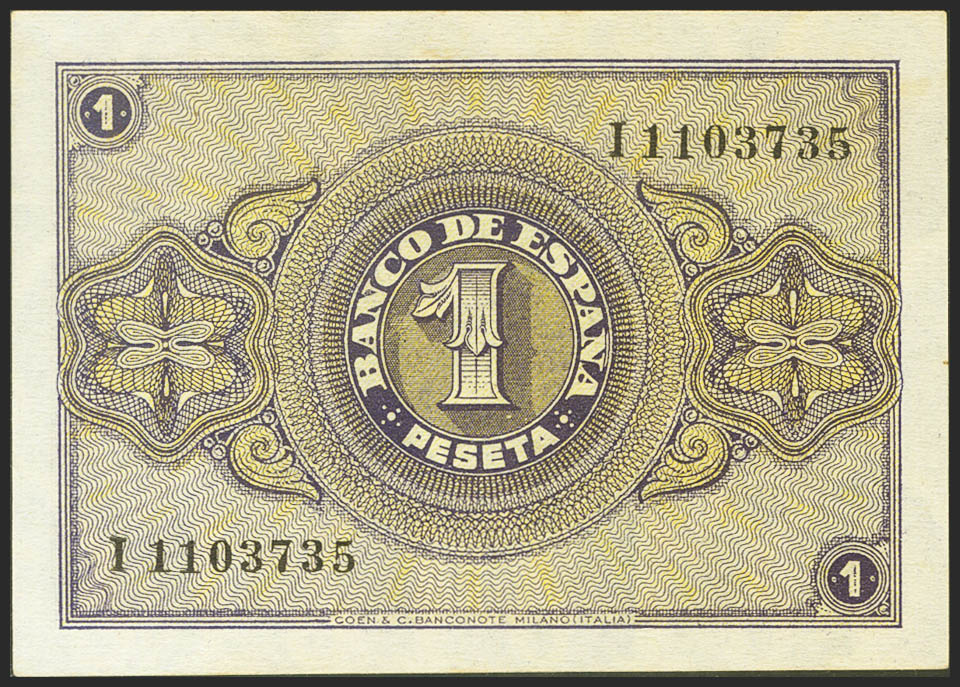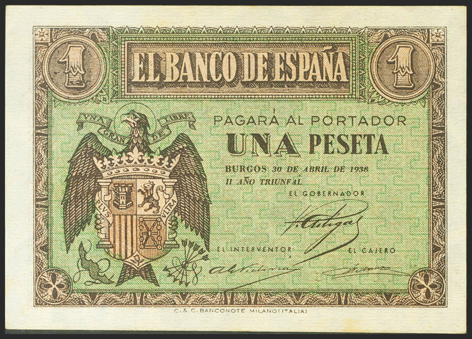 1 Peseta. April 30, 1938. Series I. (Edifil 2021: 428a). Original sizing. Almost Uncirculated.