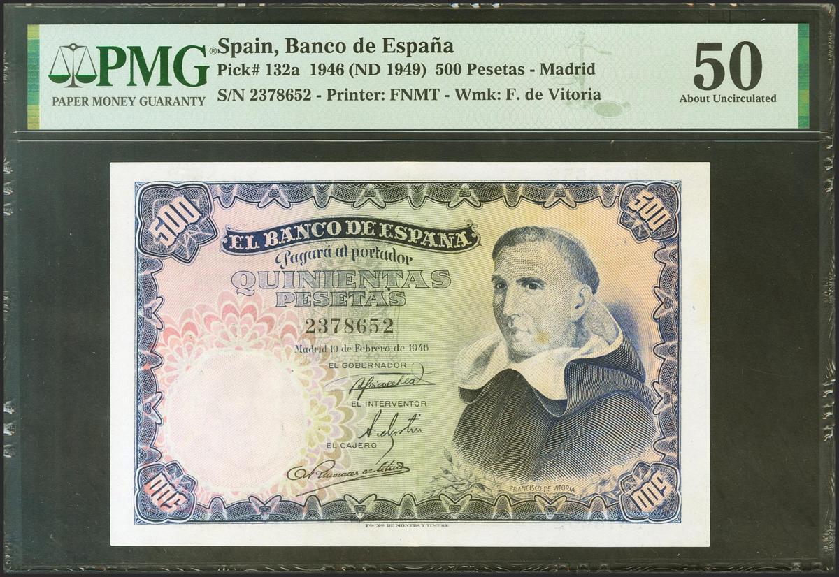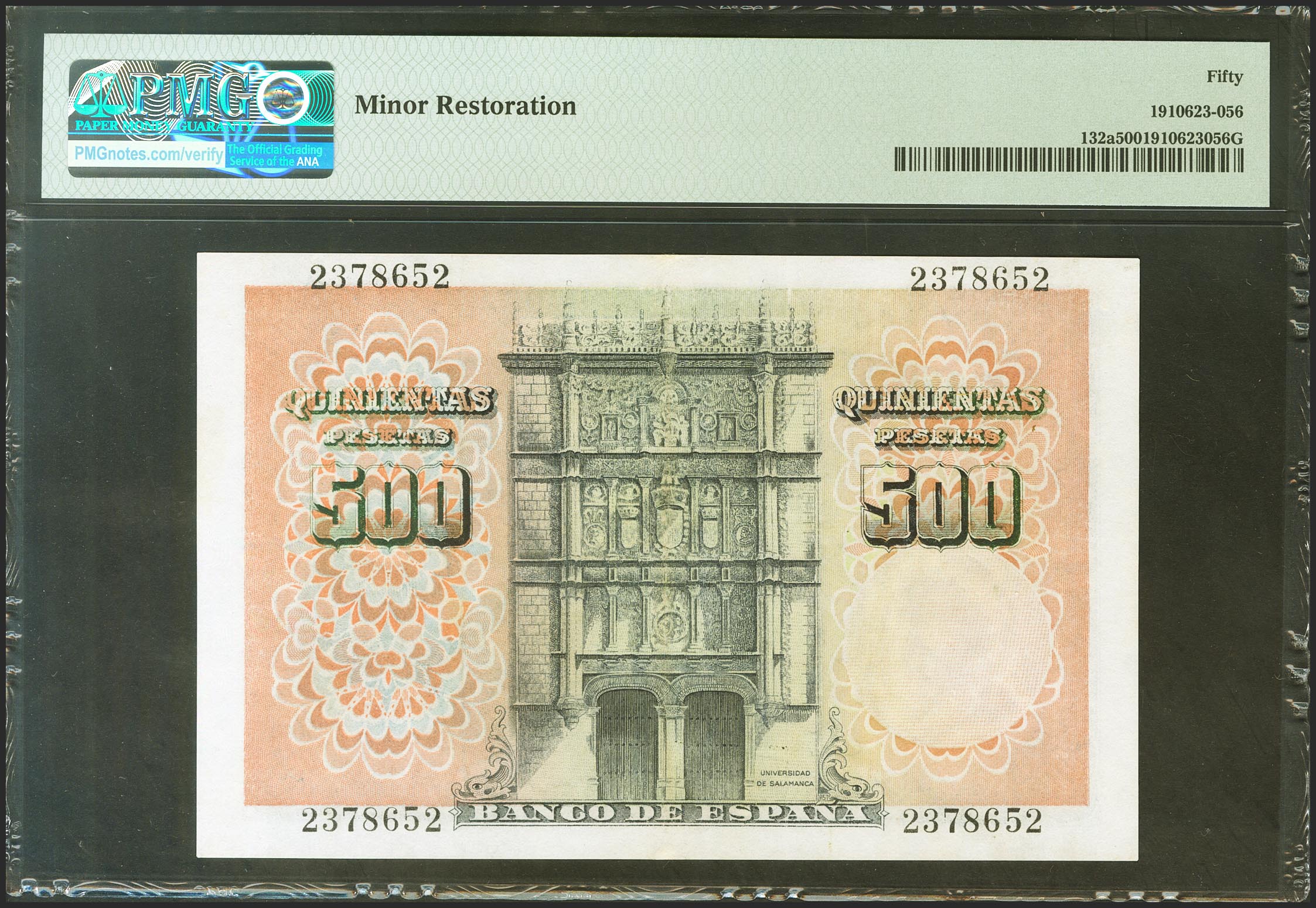 500 pesetas. February 19, 1946. No series. (Edifil 2021: 452, Pick: 132a). Rare in this quality. Extremely Fine. PMG50 encapsulation.