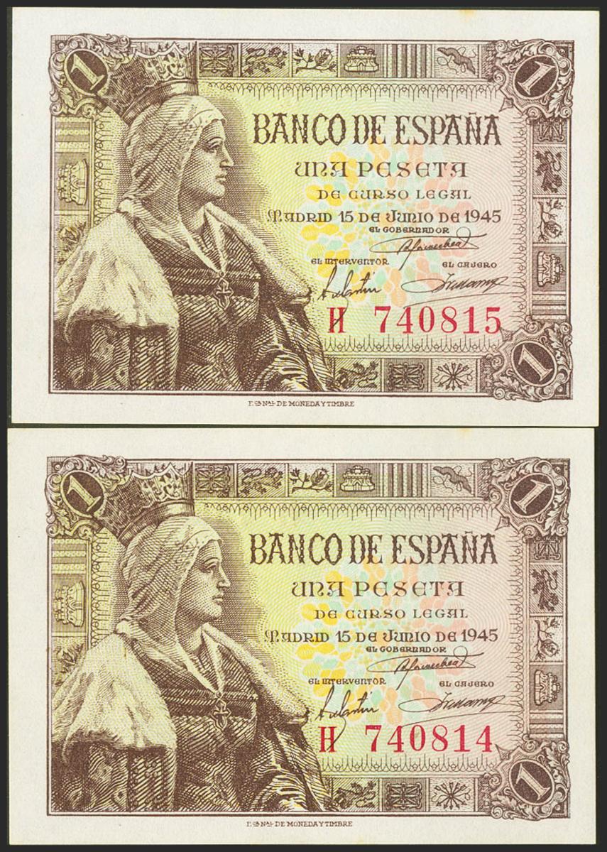 1 peseta. June 15, 1945. Correlative couple. Series H. (Edifil 2021: 448a). Original dressing, dot. Almost Uncirculated.