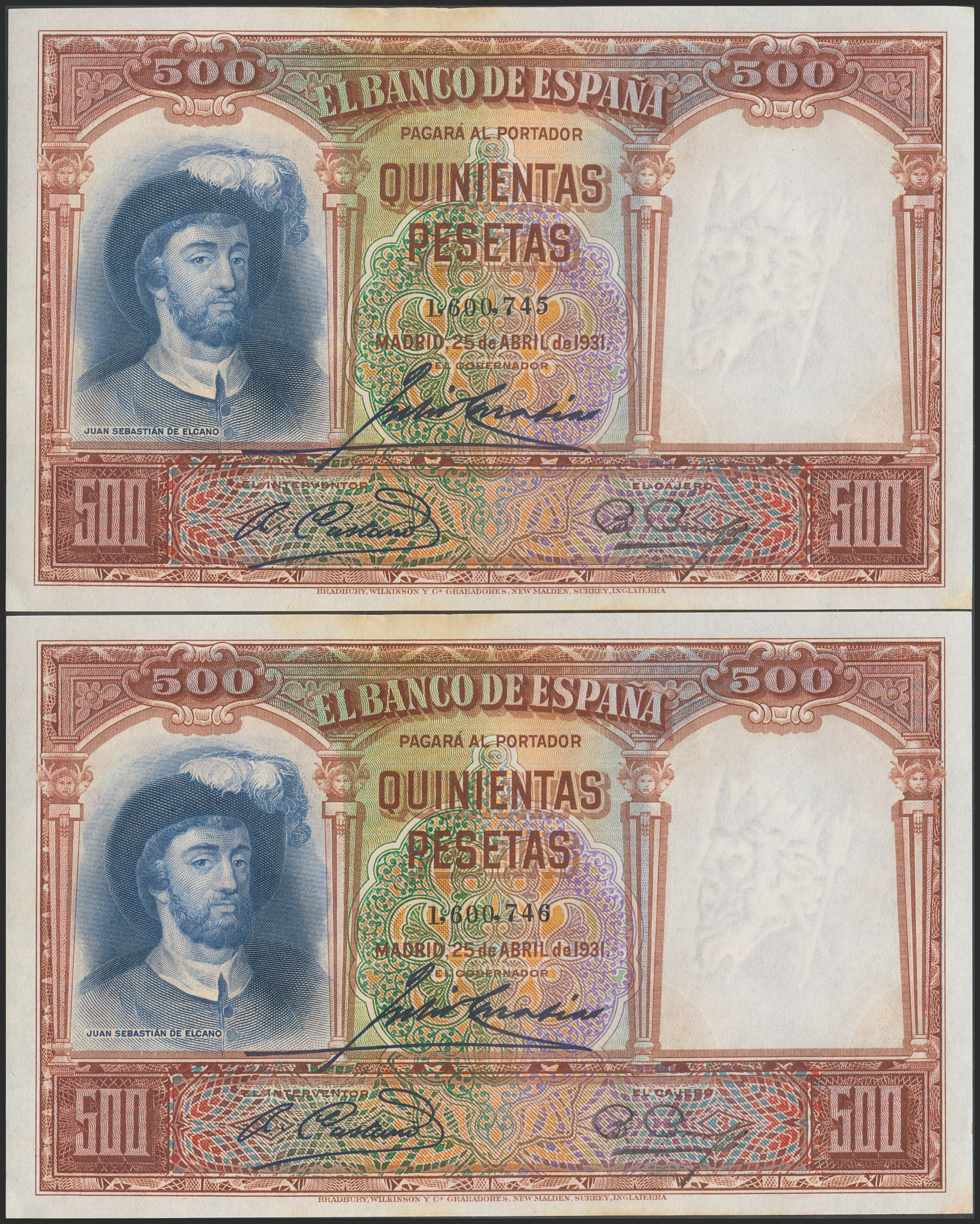 500 Pesetas. April 25, 1931. Correlative pair. No serie. (Edifil 2017: 361). It retains all the original finish, a small stain on the upper margin. Good Extremely Fine.