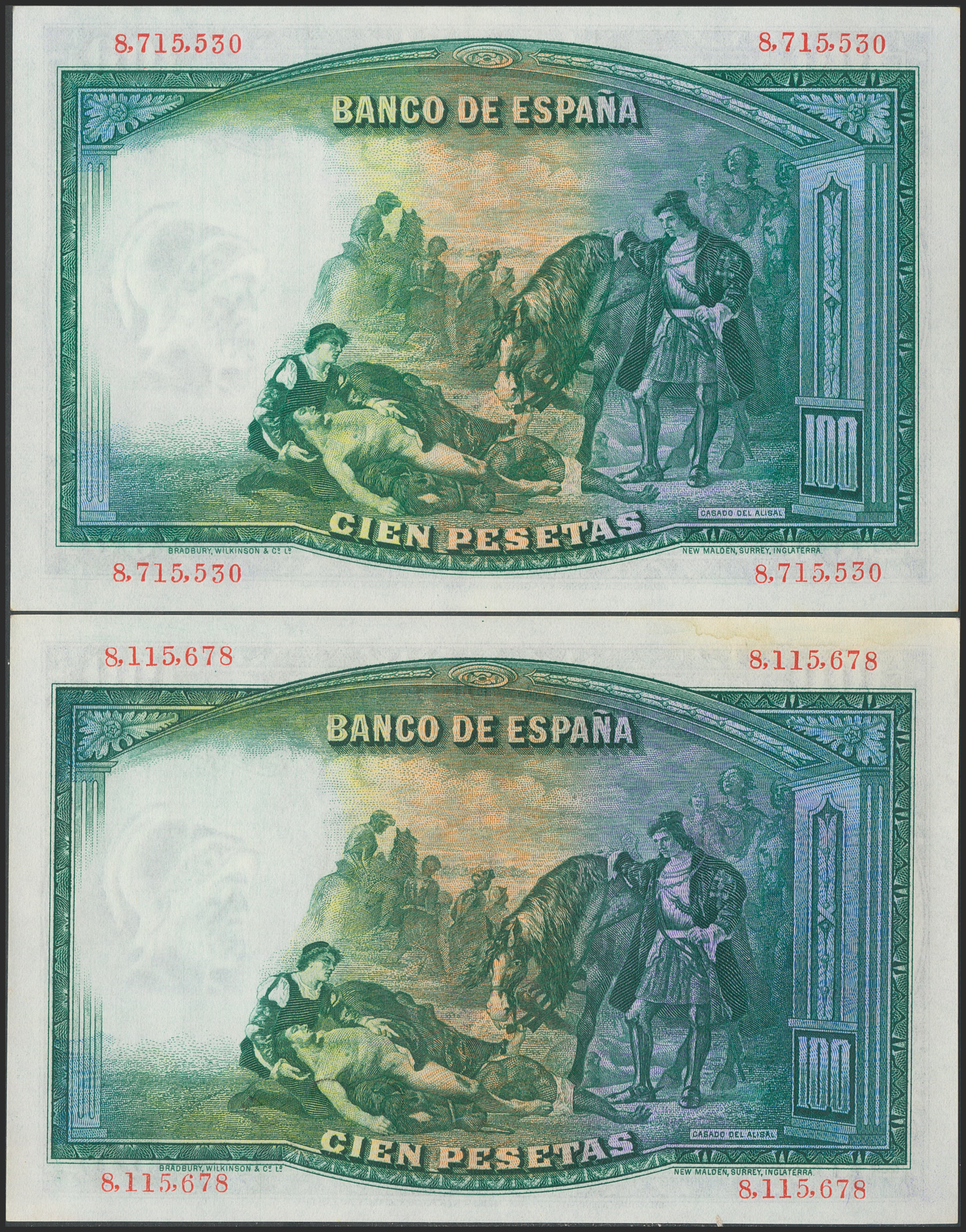 100 Pesetas. April 25, 1931. Correlative couple. No serie. (Edifil 2021: 360). Original sizing. Almost Uncirculated/ Extremely Fine.