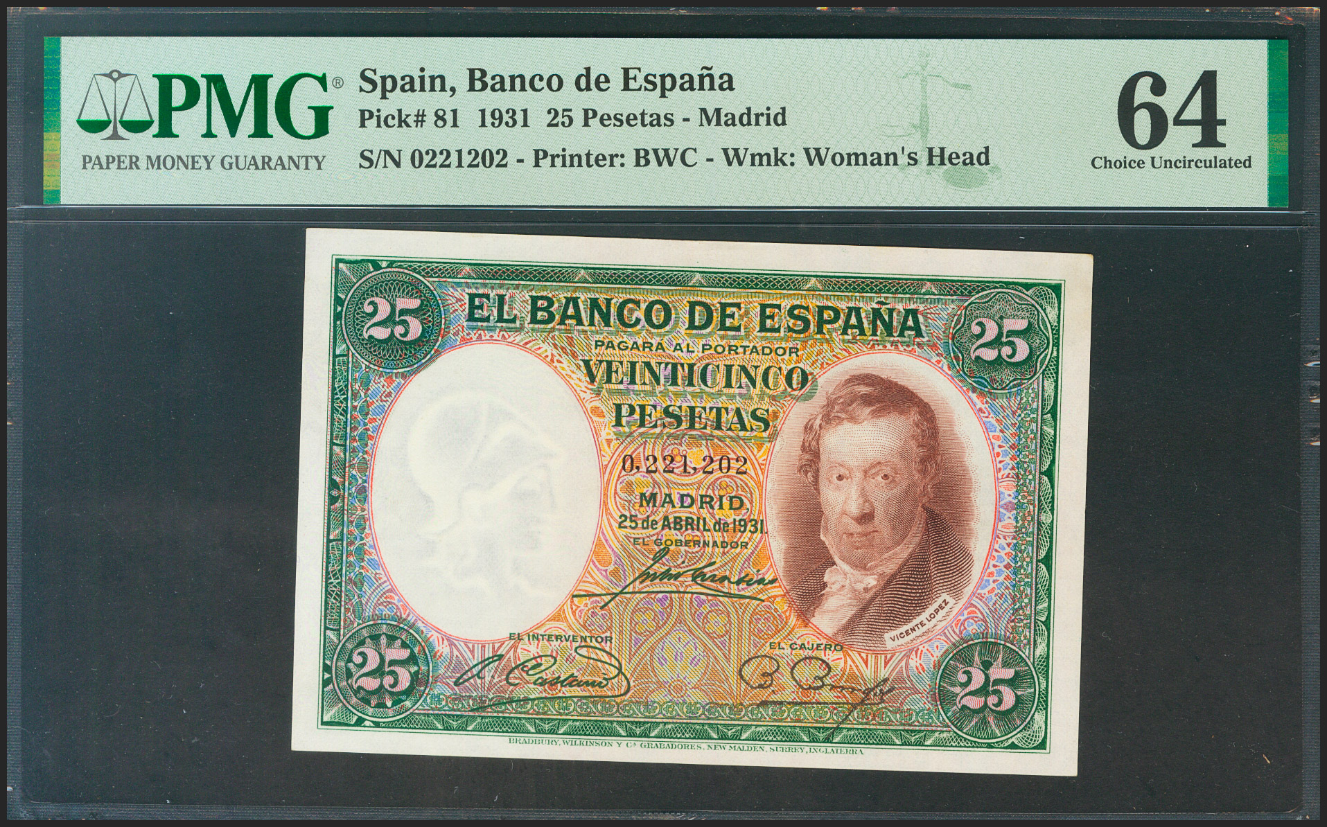 25 Pesetas. April 25, 1931. No series. (Edifil 2021: 358, Pick: 81). Unusual in this quality. Uncirculated. PMG64 encapsulation.