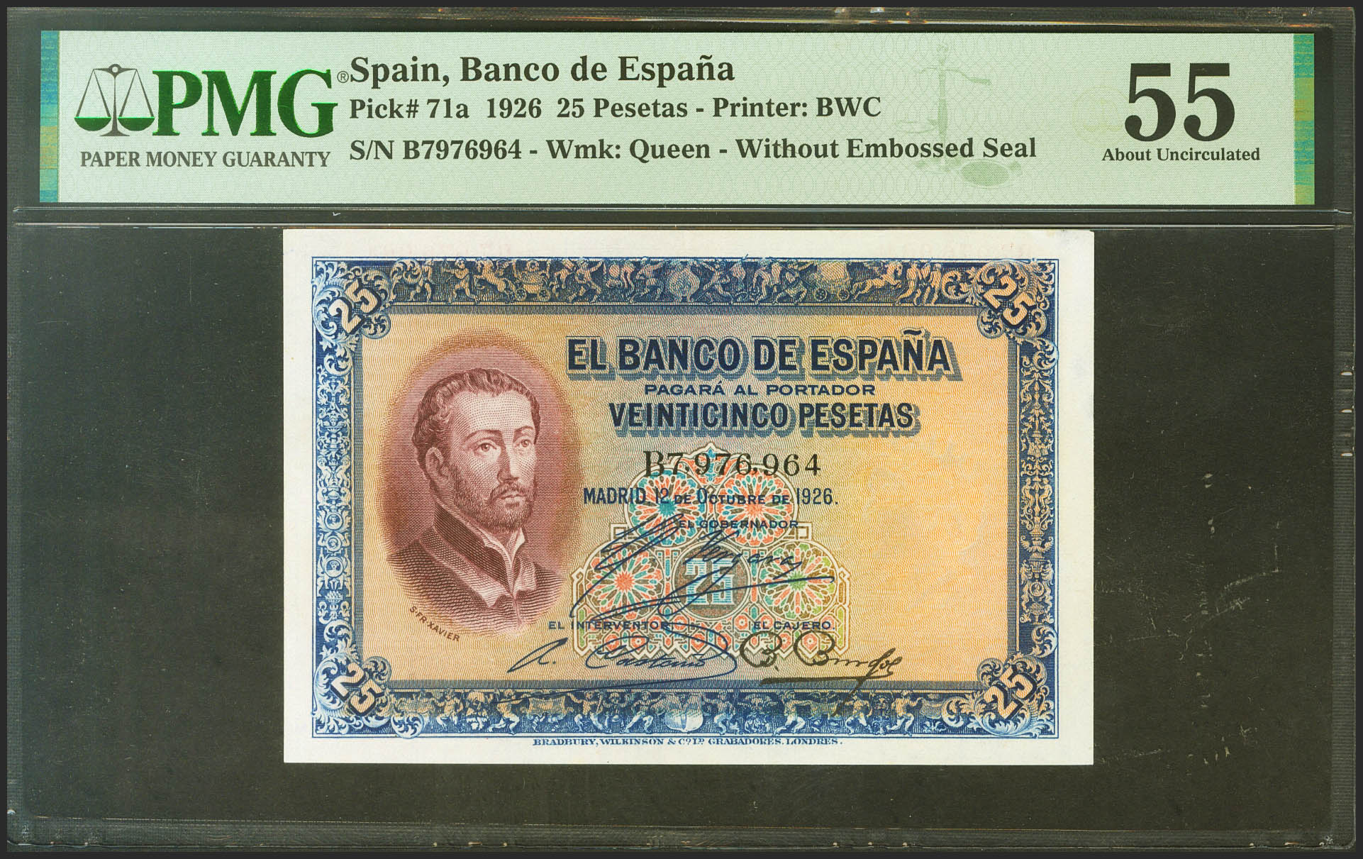 English 25 Pesetas. October 12, 1926. Series B, last series issued. (Edifil 2021: 325a, Pick: 71a). Unusual in this quality. Good Extremely Fine. PMG55 encapsulation.