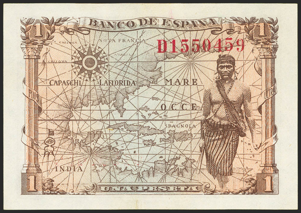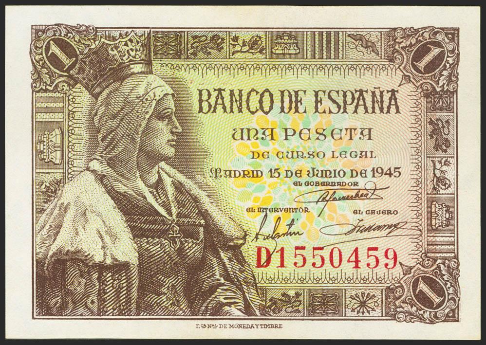 1 Peseta. June 15, 1945. Series D. (Edifil 2021: 448a). Original sizing. Uncirculated.