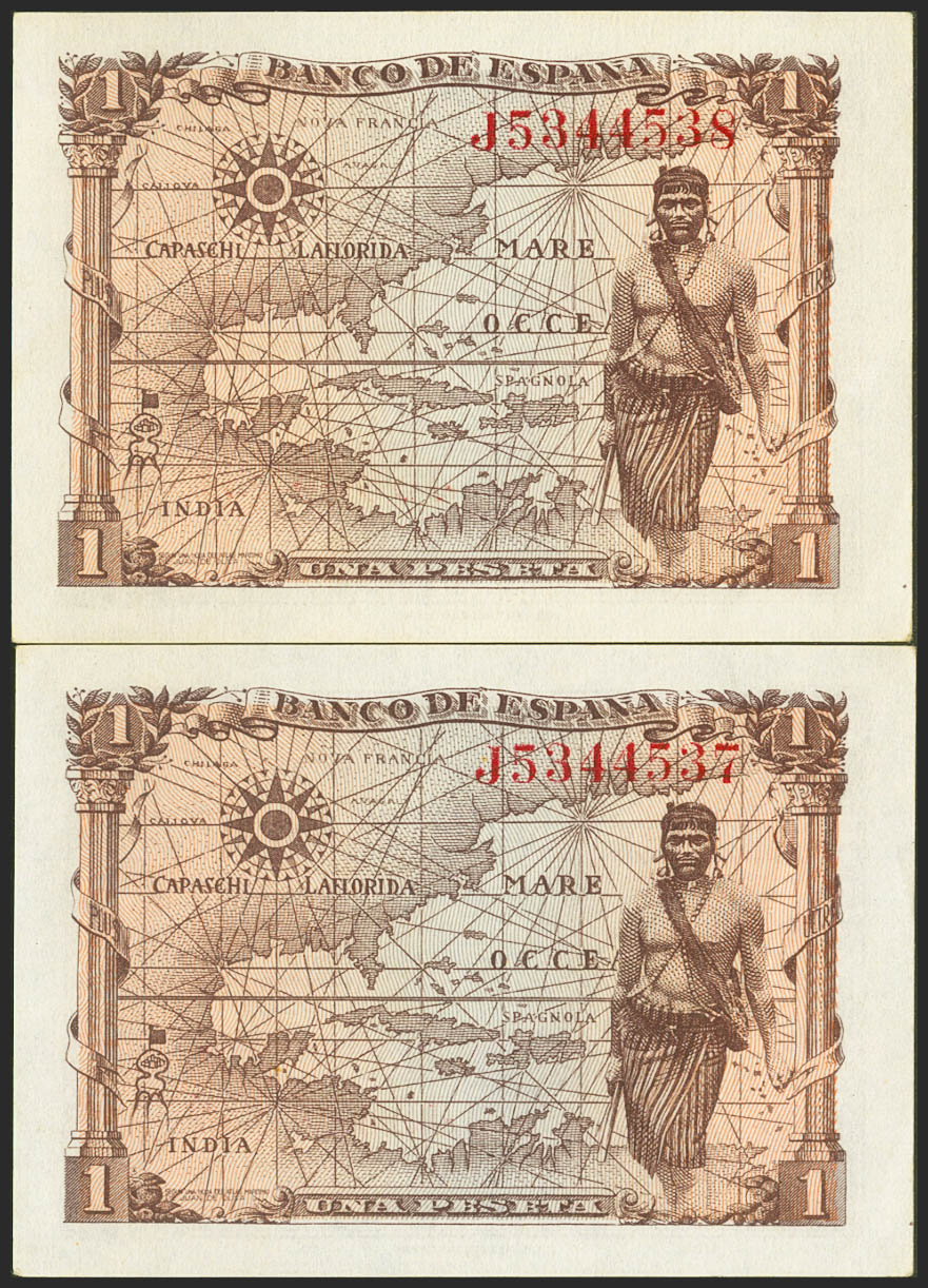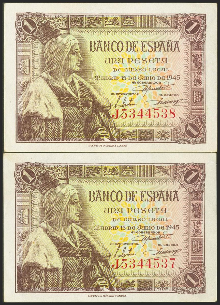 English 1 Peseta. June 15, 1945. Correlative couple. Series J. (Edifil 2021: 448a). Original sizing. Almost Uncirculated-.