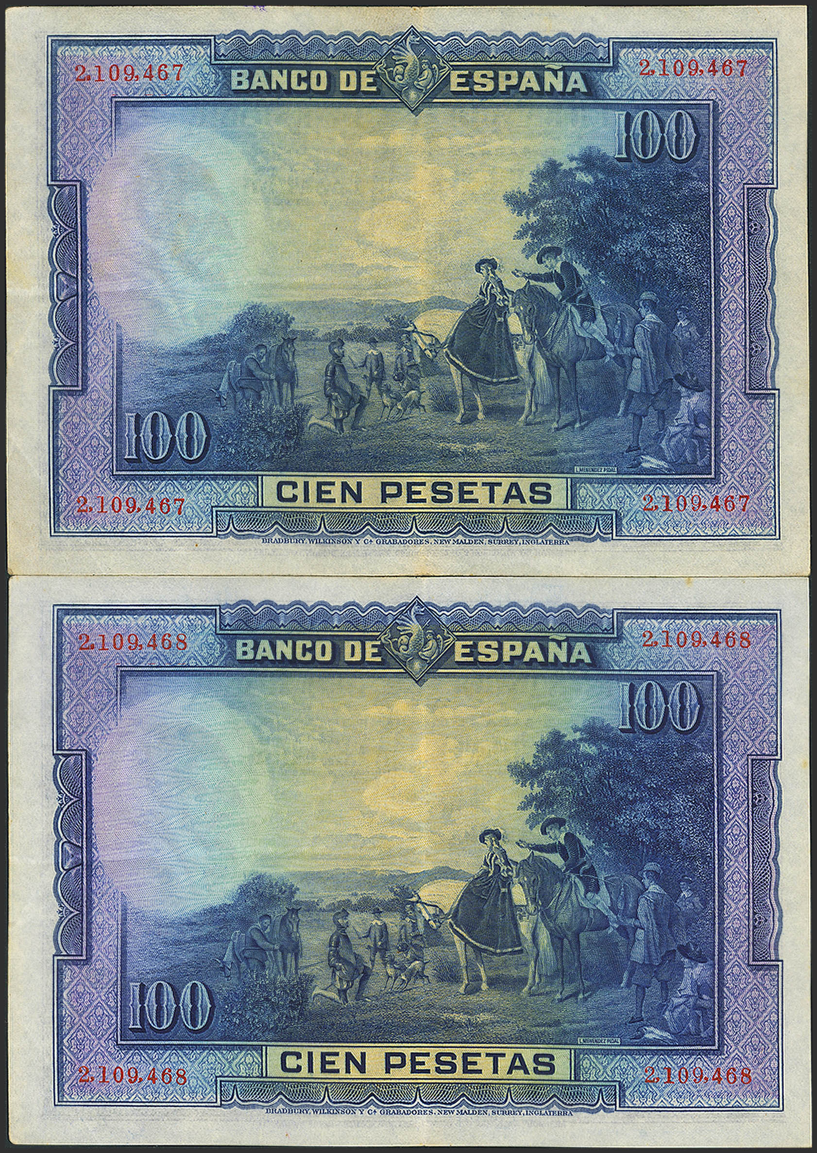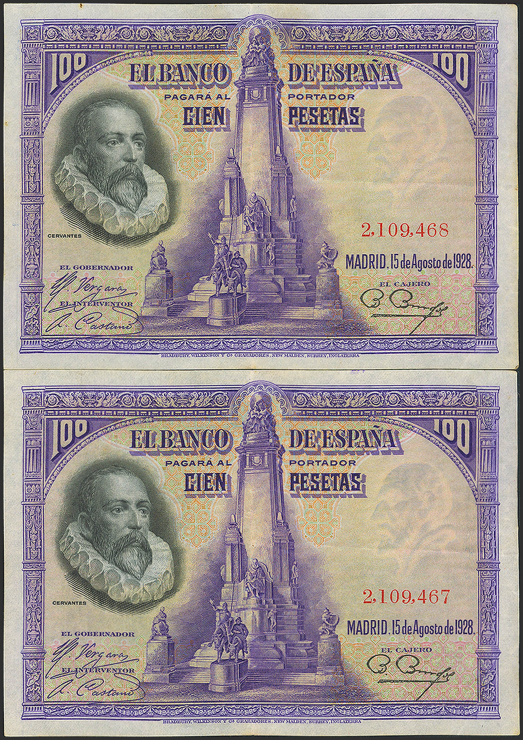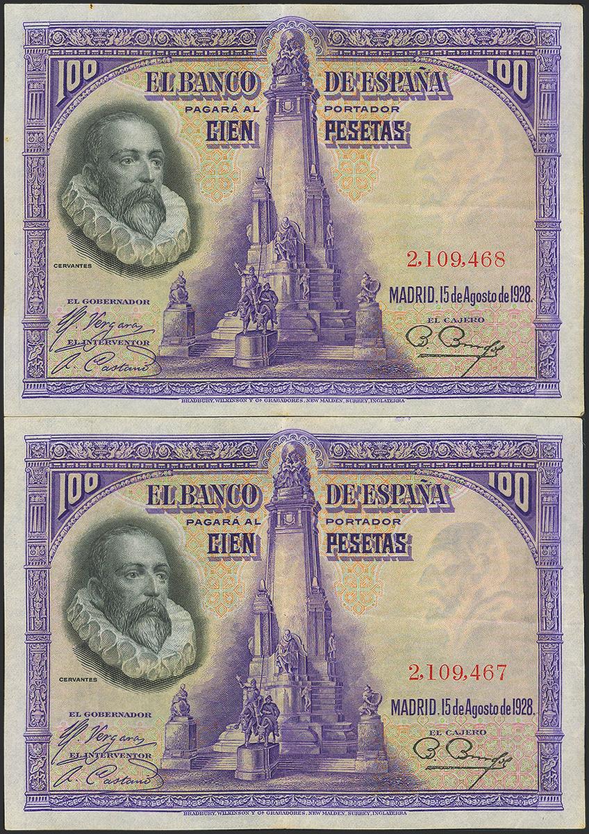 100 Pesetas. August 15, 1928. Correlative couple. No serie. (Edifil 2021: 355). Unusual in this quality, original sizing. Good Extremely Fine.