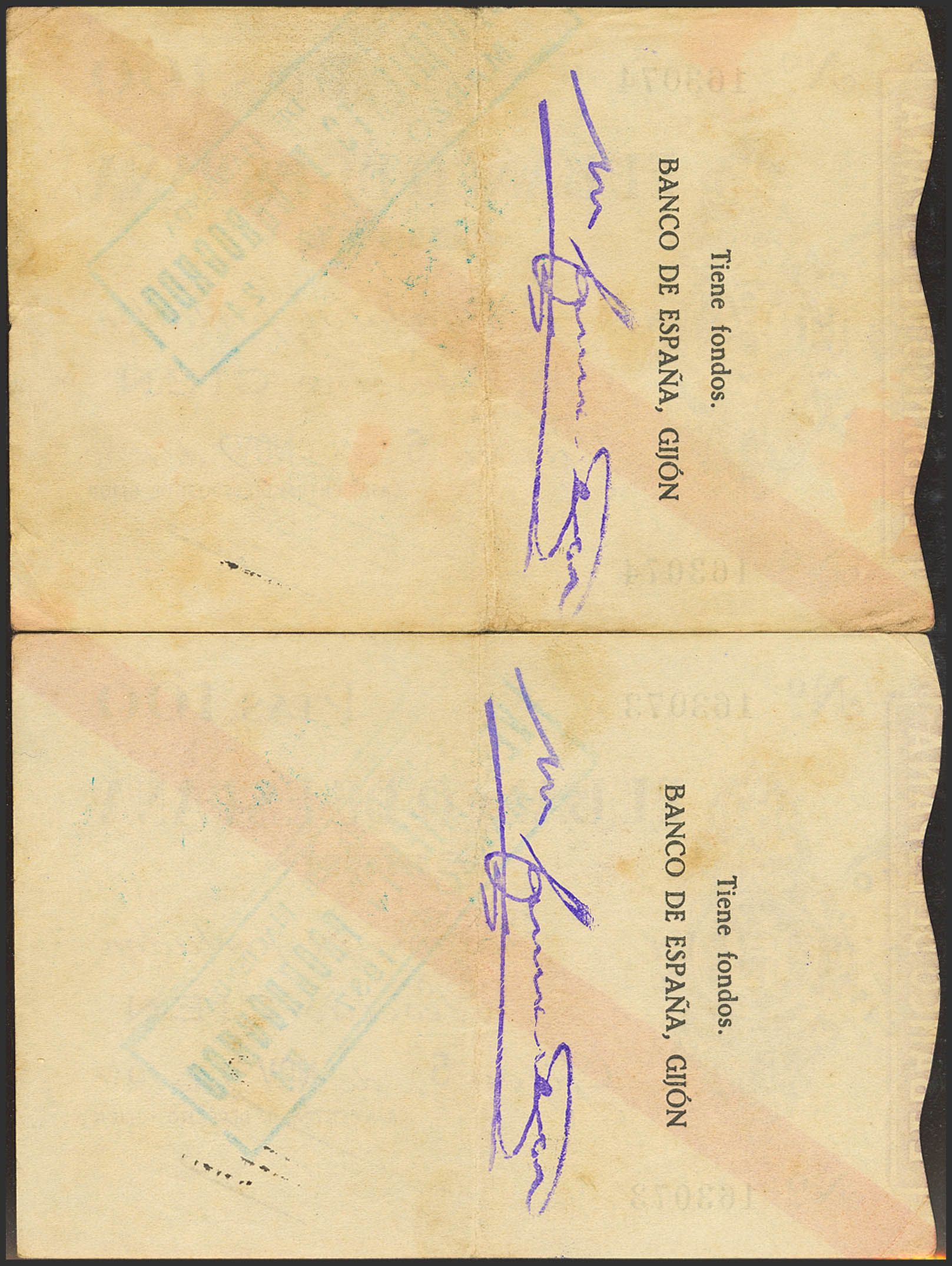 100 Pesetas. November 5, 1936. Gijón Branch. Correlative couple. No serie. (Edifil 2021: 384). Very rare pair, especially in this exceptional quality for this note, which is always in low qualities. Extremely Fine.