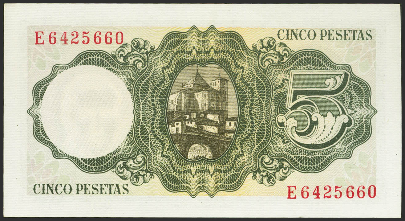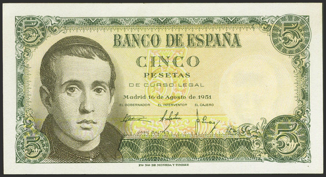5 Pesetas. August 16, 1951. Series E. (Edifil 2021: 459a). Original sizing. Almost Uncirculated.