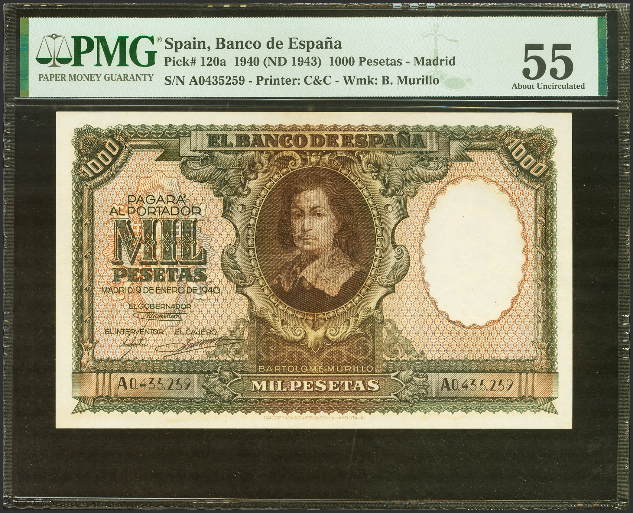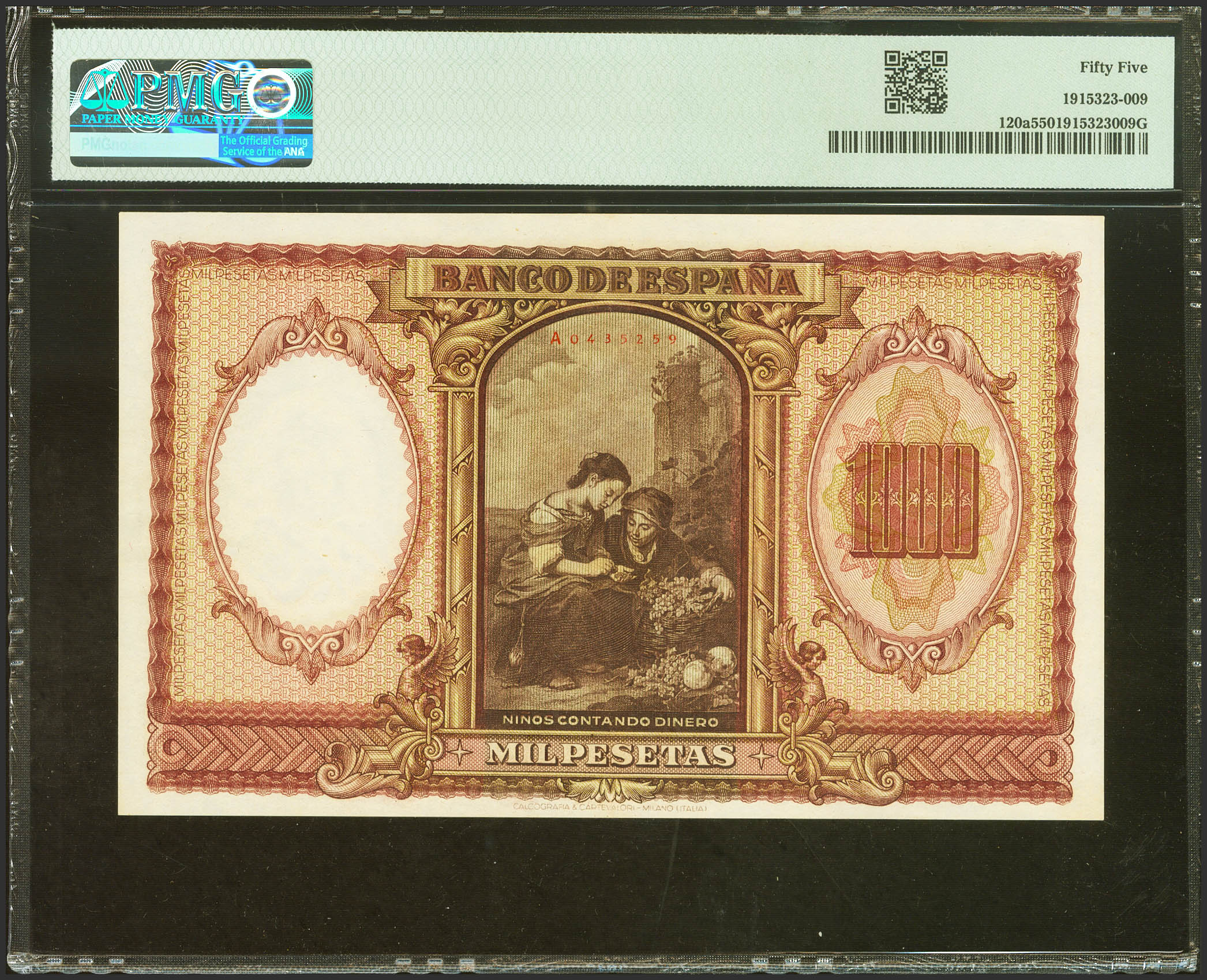 English 1000 Pesetas. January 9, 1940. Series A. (Edifil 2023: 440, Pick: 120a). Good Extremely Fine. PMG55 encapsulation.