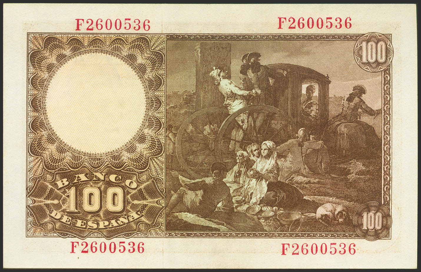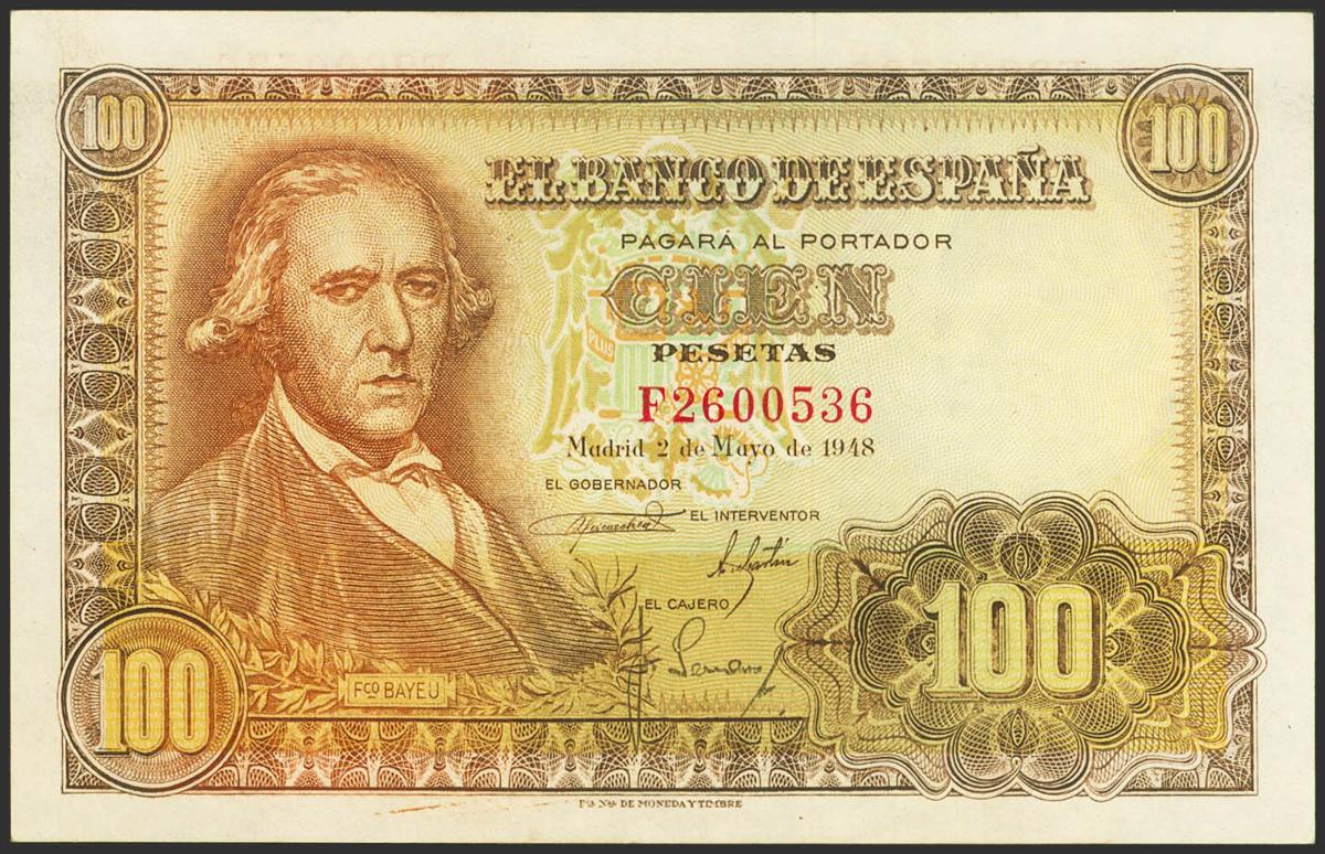 English 100 Pesetas. May 2, 1948. Series F. (Edifil 2023: 456a). It retains much of the original finish. Good Extremely Fine.