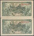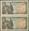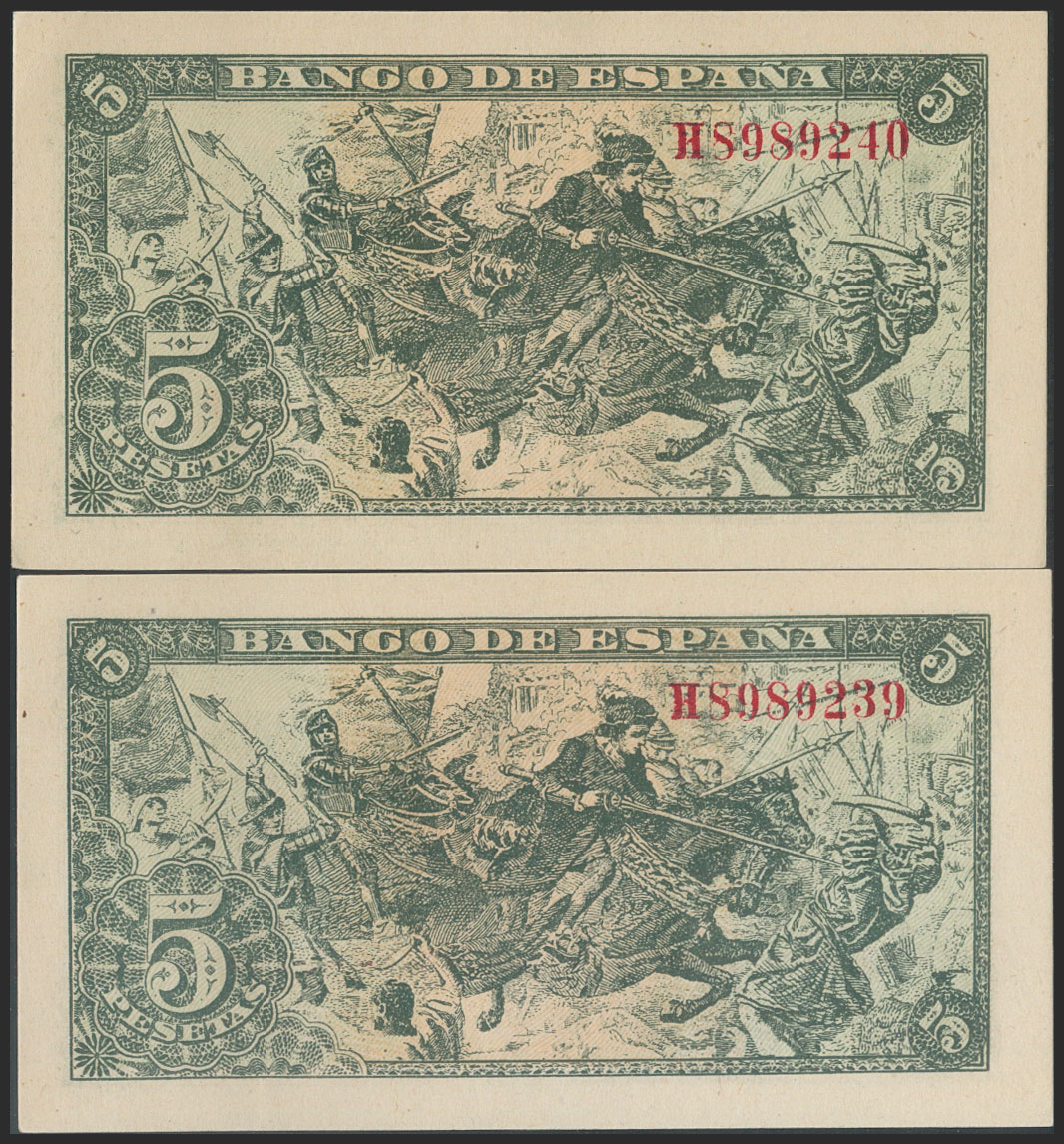 5 Pesetas. 15 de Junio de 1945. Pareja correlativa. Serie H. Falso de época. (Edifil 2017: 449F). Inusual. SC-.