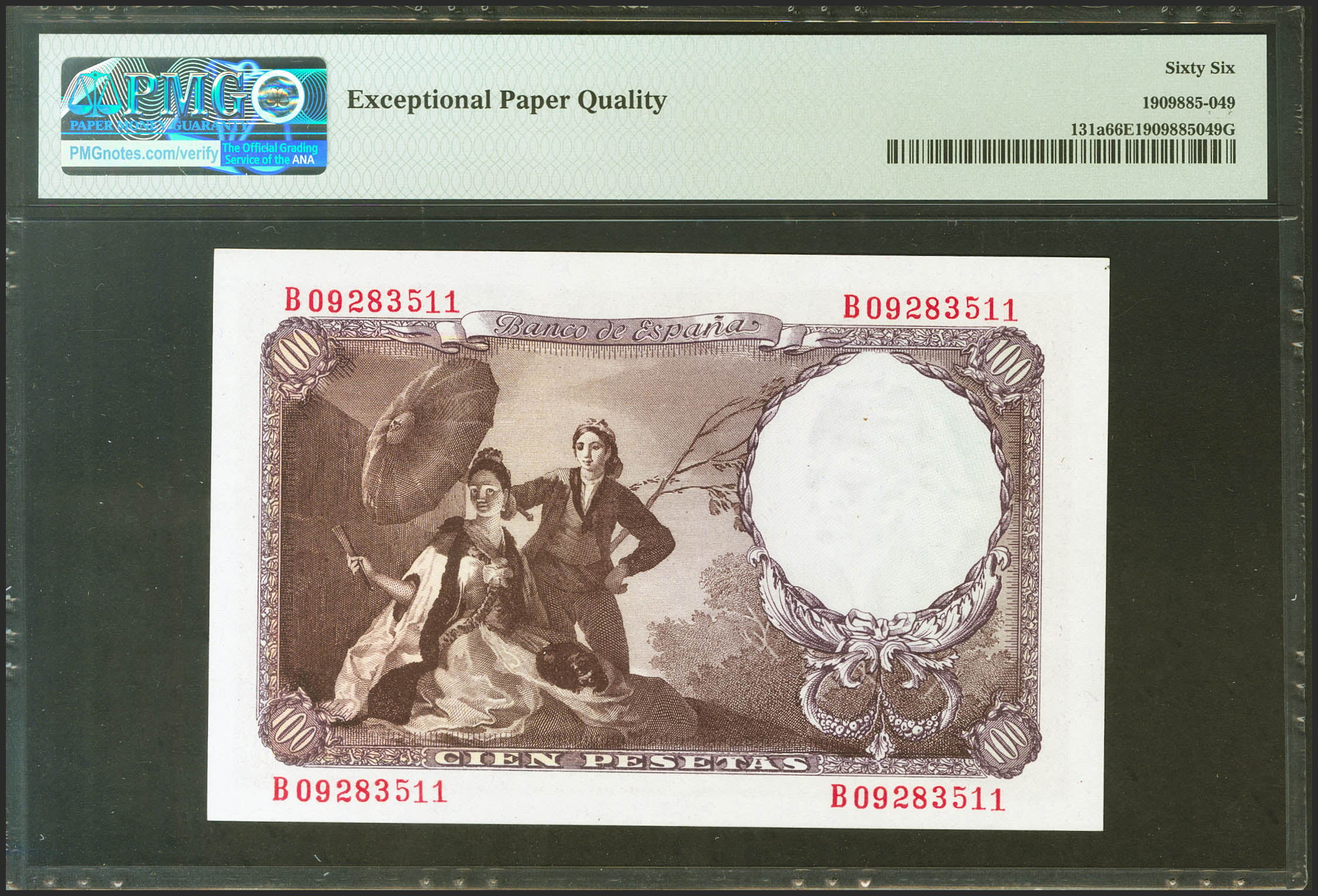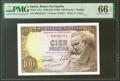 100 Pesetas. 19 de Febrero de 1946. Serie B. (Edifil 2021: 451b, Pick: 131a). Raro en esta excepcional calidad, apresto original. SC. Encapsulado PMG66EPQ.