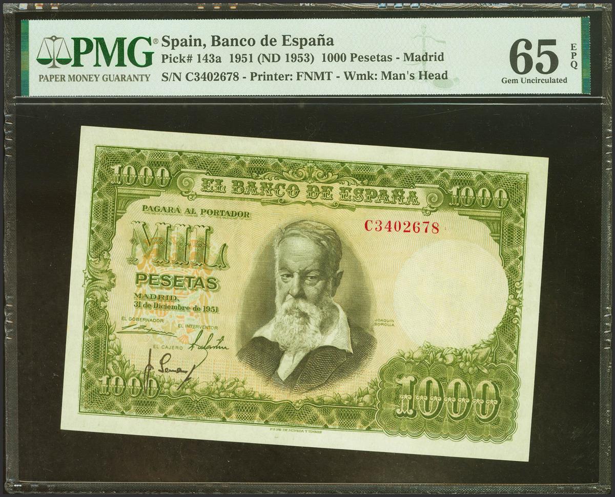 1000 Pesetas. 31 de Diciembre de 1951. Serie C, última serie emitida. (Edifil 2023: 463b, Pick: 143a). Raro en esta excepcional calidad, apresto original. SC. Encapsulado PMG65EPQ.