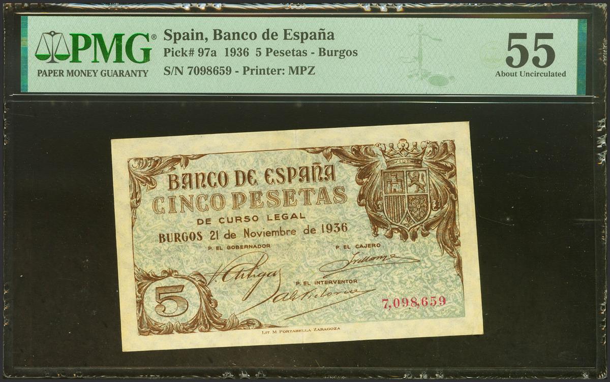 5 Pesetas. 21 de Noviembre de 1936. Sin serie. (Edifil 2023: 417, Pick: 97a). Raro, especialmente en esta excepcional calidad para este billete. EBC. Encapsulado PMG55.