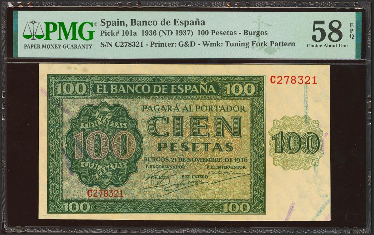 100 Pesetas. 21 de Noviembre de 1936. Serie C. (Edifil 2023: 421a, Pick: 101a). Apresto original. EBC++. Encapsulado PMG58EPQ.