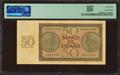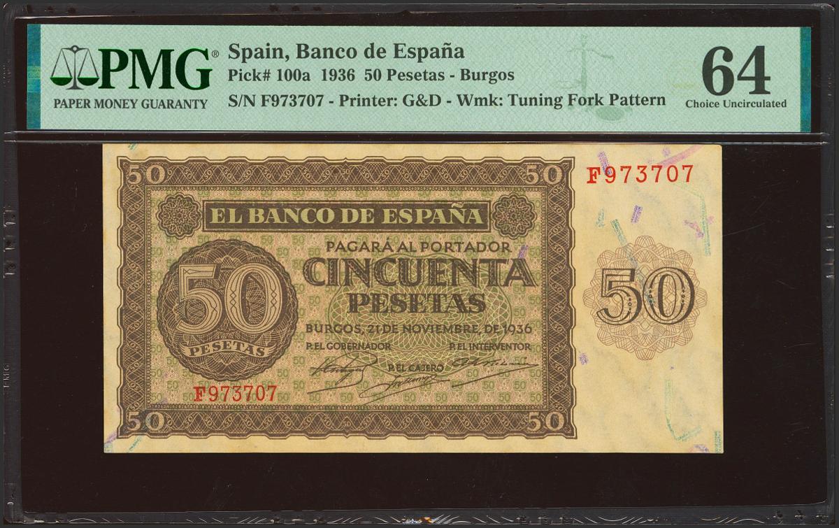 English 50 Pesetas. November 21, 1936. Series F. (Edifil 2023: 420a, Pick: 100a). Rare in this exceptional quality, original finish. Uncirculated. Encapsulated PMG64.