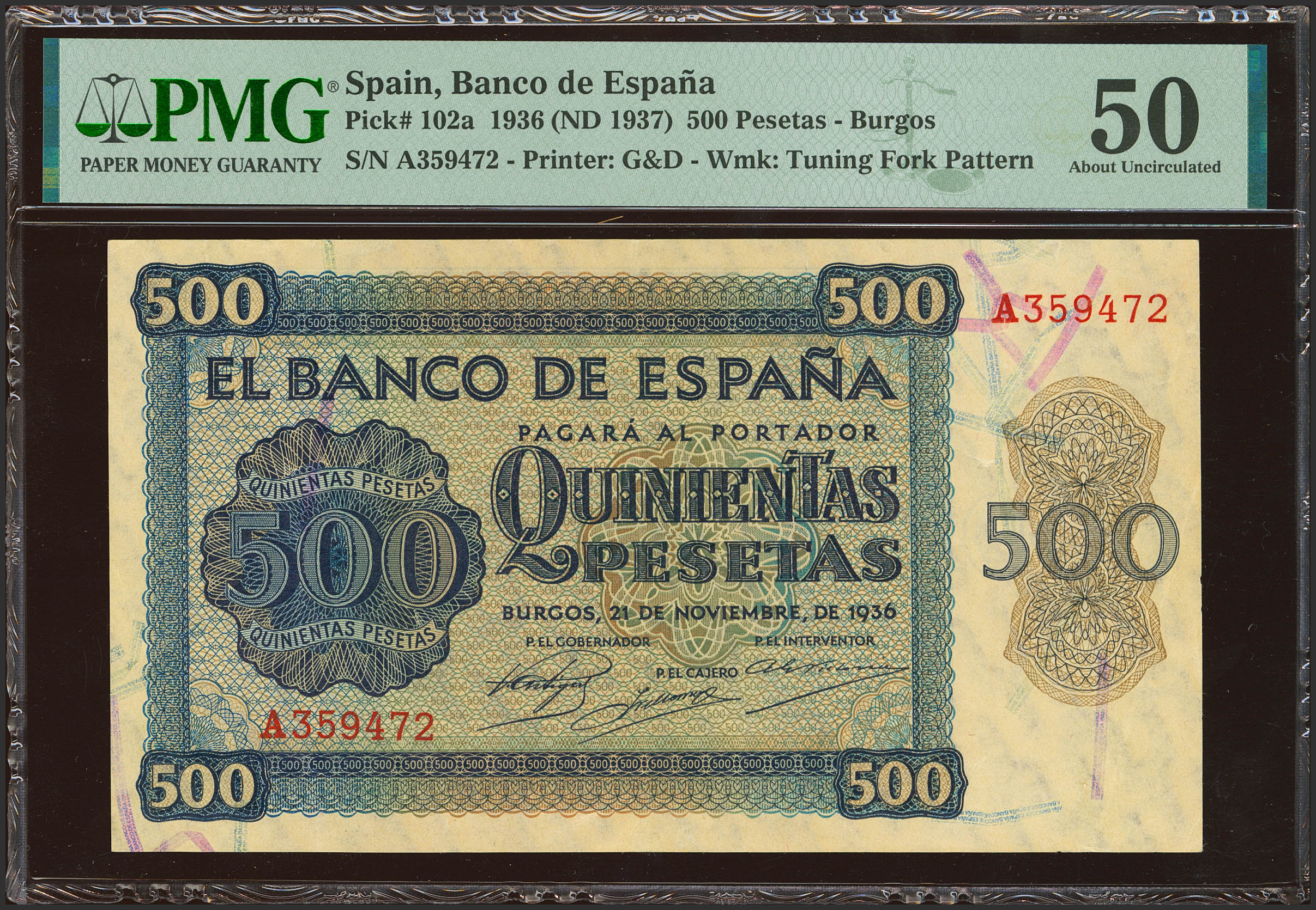 500 Pesetas. November 21, 1936. Series A. (Edifil 2023: 422, Pick: 102a). Extremely Fine. Encapsulated PMG50.