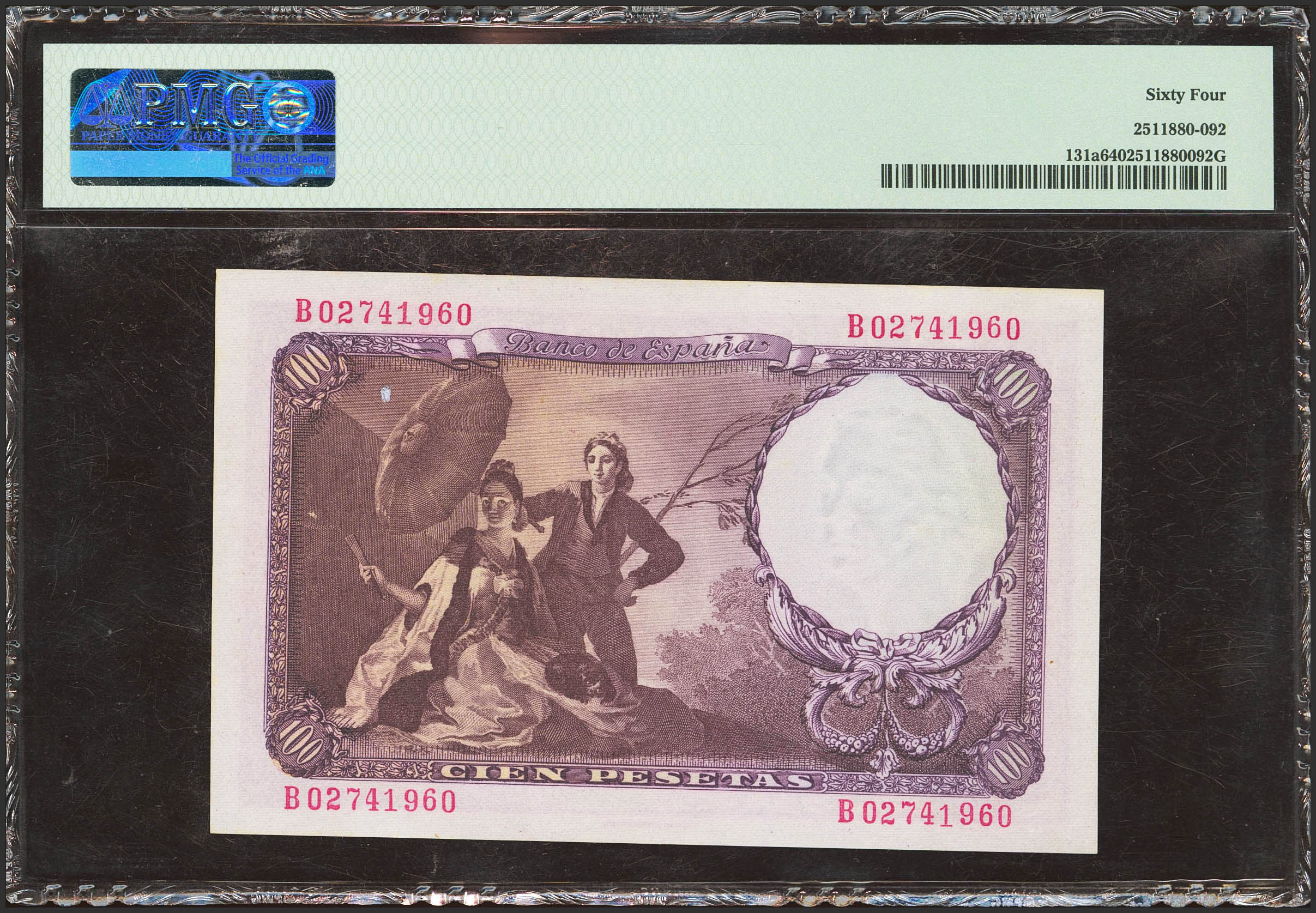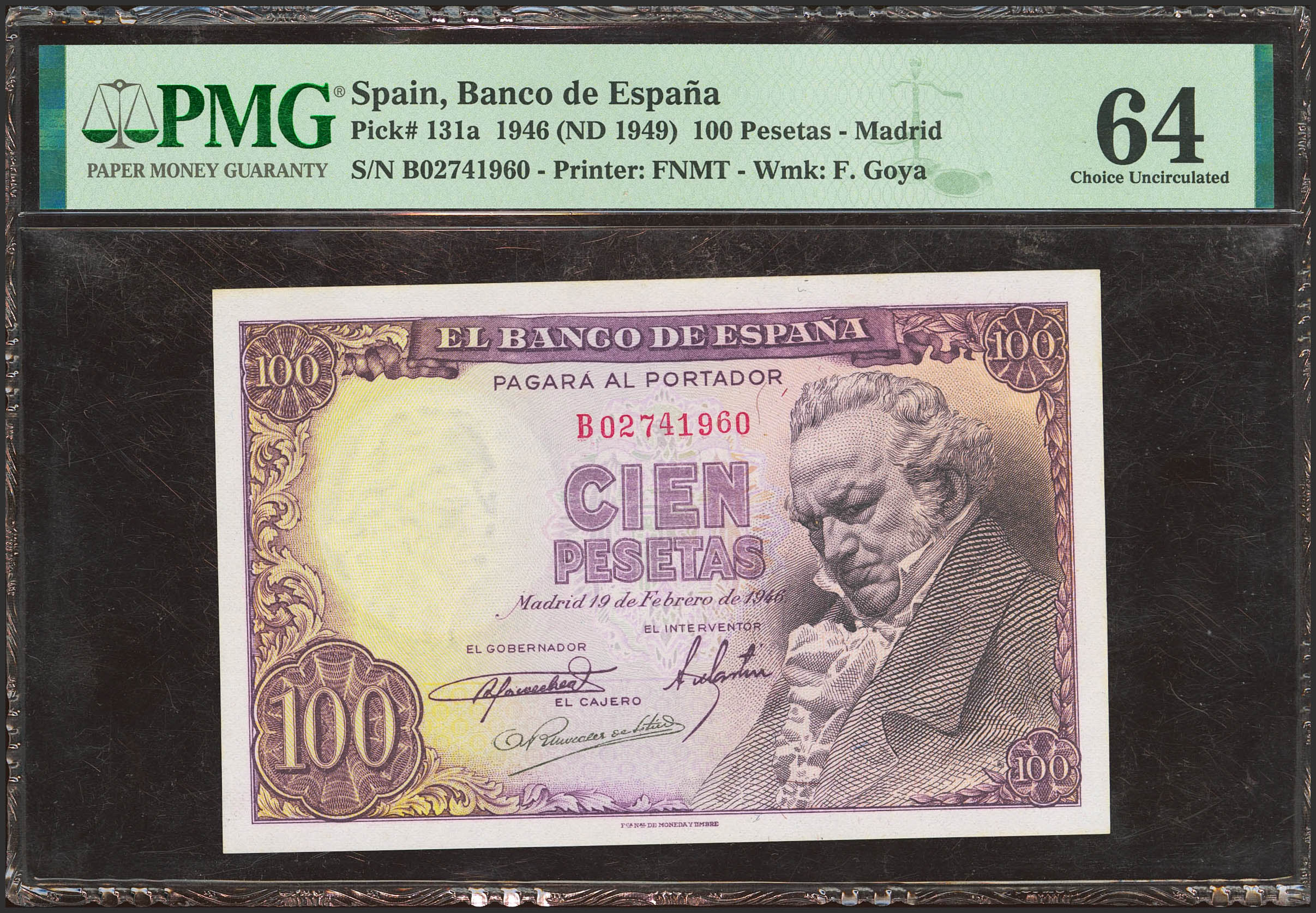 100 Pesetas. February 19, 1946. Series B. (Edifil 2021: 451b). Unusual in this quality. Uncirculated. Encapsulated PMG64.