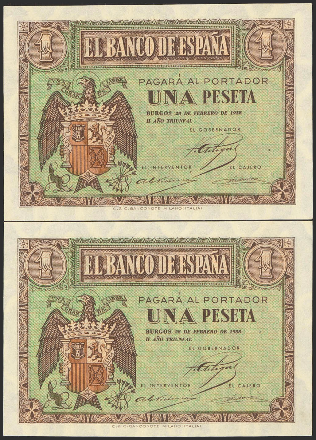 1 Peseta. February 28, 1938. Correlative pair. Series C. (Edifil 2023: 427a). It retains all its original appearance. Uncirculated.