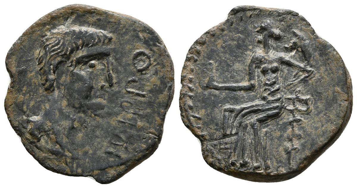 IRIPPO. As. 30 BC CercanÃas de Sevilla. A / Head of Octavio? on the right, in front of the external legend IRIPPO, around laurea. R / Female deity seated to the right with pineapple and cornucopia surrounded by laurea. FAB-1581. Ae. 5.38g. Good Very Fine.