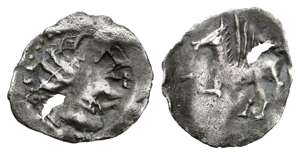 EMPORITON (Emporitan imitation). Tritartemorion. Sant Martà de Ampurias (Gerona). 450-400 Fine A/ Female head right. R/ Pegasus left. FAB-not catalogued. Ar. 0.19g. Perforation. VF.