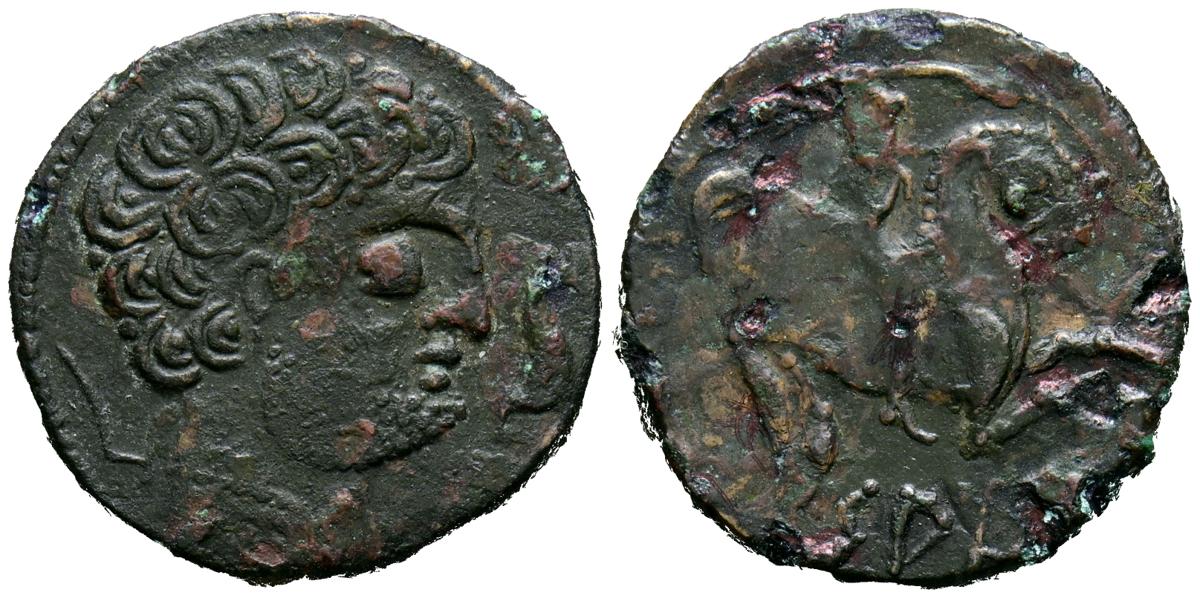 ARSAOS (Navarre area). As. (Ae. 7.67g/23mm). 120-80 Fine (FAB-144). Anv: Bearded male head to right, between two dolphins. Reverse: Horseman with dart to right, below Iberian legend: ARSAOS. VF-. Cleaned.