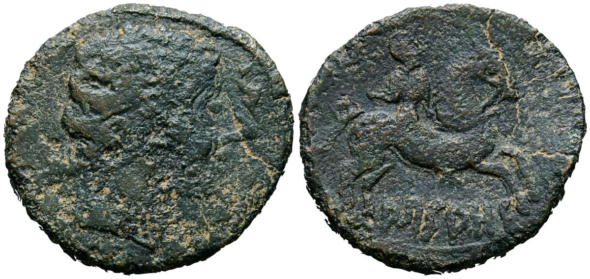 English ARSAOS (Navarre area). As. (Ae. 10.81g/29mm). 120-80 Fine (FAB-144). Anv: Bearded male head to right, between two dolphins. Rev: Horseman with dart to right, below Iberian legend: ARSAOS. Good Fine.