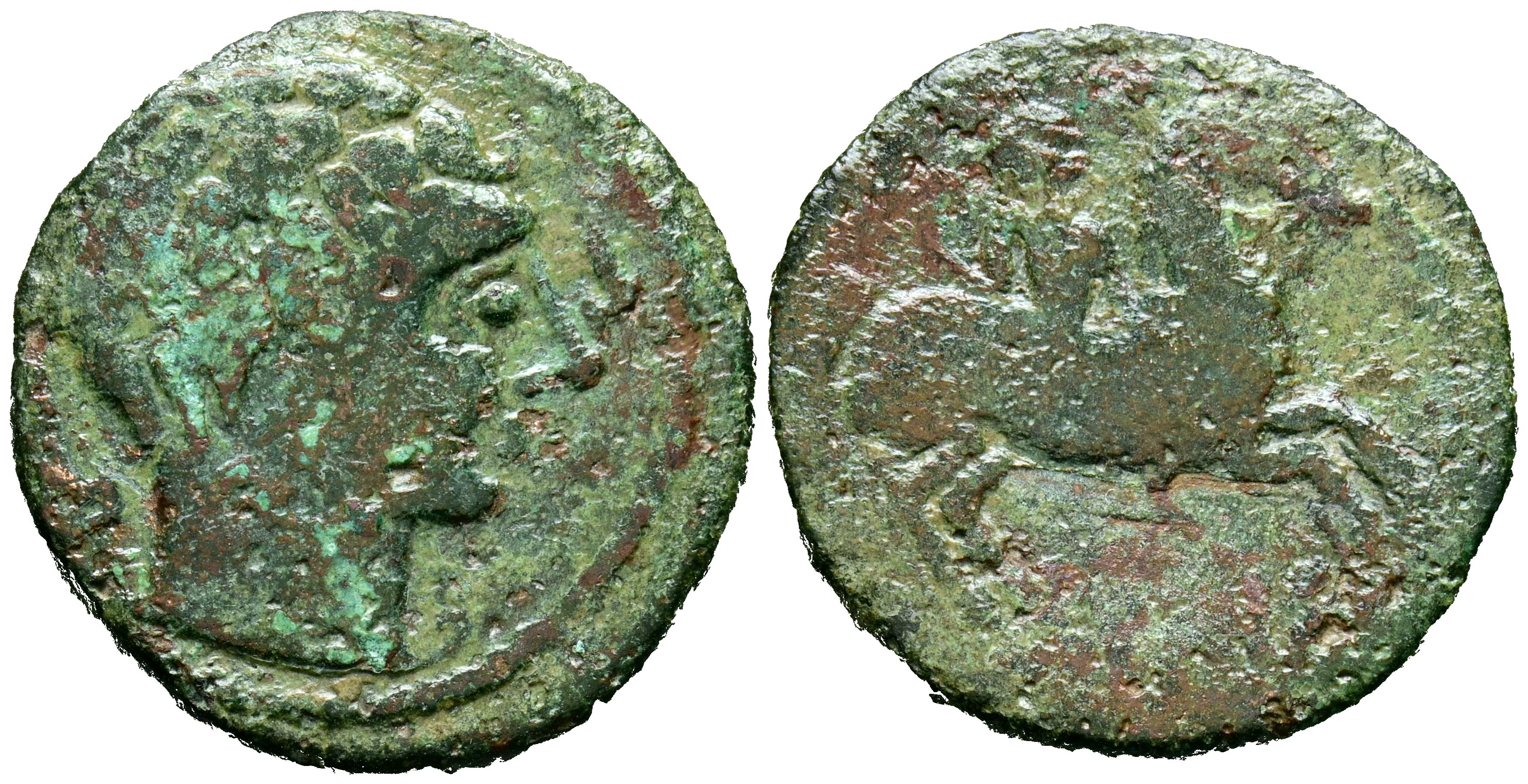 English ARSAOS (Navarre area). As. (Ae. 9.31g/26mm). 120-80 Fine (FAB-145). Anv: Bearded male head facing right between two dolphins, degenerate art. Reverse: Horseman with dart facing right, below legend line: ARSAOS, degenerate art. Good Fine.