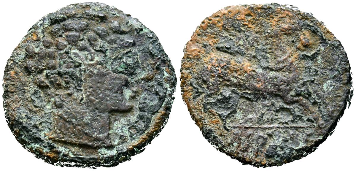 ARSAOS (Navarre area). As. (Ae. 7.18g/22mm). 120-80 Fine (FAB-145). Anv: Bearded male head facing right between two dolphins, degenerate art. Reverse: Horseman with dart facing right, below legend line: ARSAOS, degenerate art. Fine.