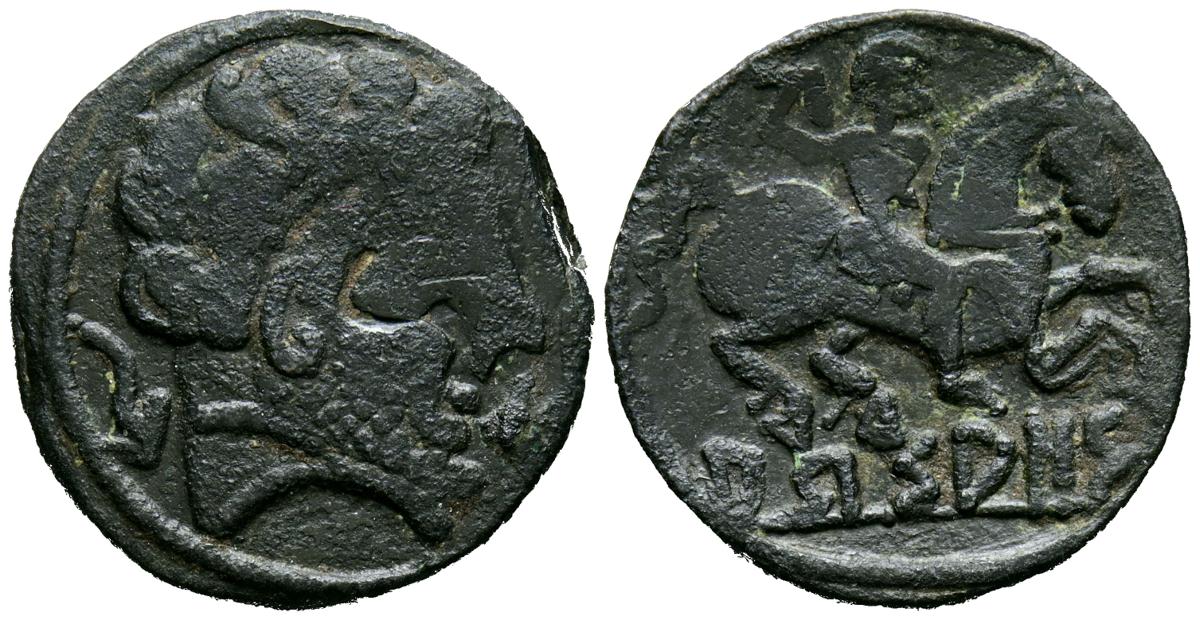 English ARSAOS (Navarre area). As. (Ae. 6.34g/22mm). 120-80 Fine (FAB-145). Obv: Bearded male head facing right between two dolphins, degenerate art. Reverse: Horseman with dart facing right, below legend line: ARSAOS, degenerate art. VF.