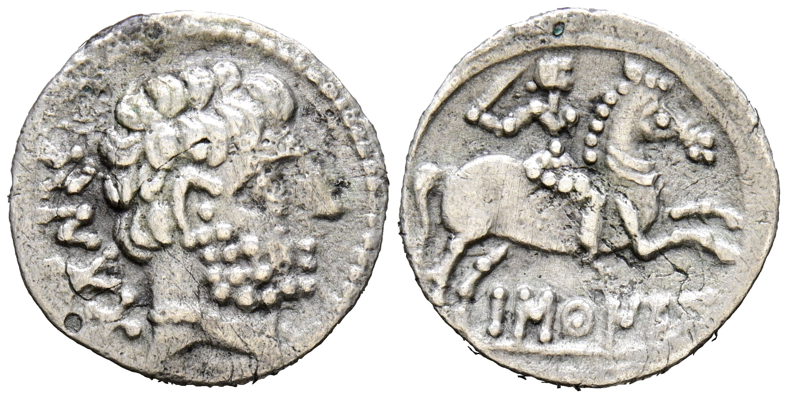 BAUncirculatedUNES (Pamplona). Denarius. (Ar. 3.47g/18mm). 120-20 Fine (FAB-215). Obv: Bearded male head right, behind Iberian legend BeNCoDa. Rev: Horseman with sword right, below Iberian legend BaUncirculateduNES. VF.