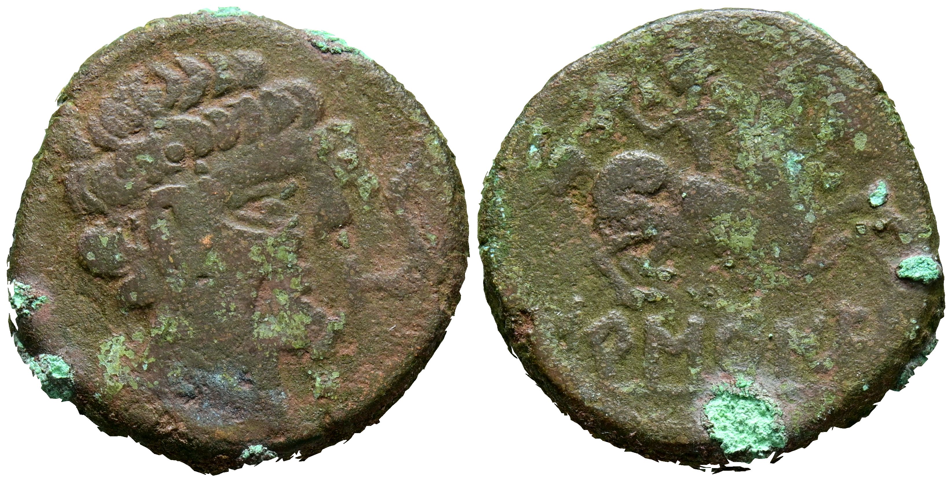 BARUncirculatedUNES (Pamplona, Navarra). As. (Ae. 9.72g/23mm). 120-20 Fine (FAB-223). Anv: Male head right, in front of a dolphin. Rev: Horseman with sword right, below Iberian legend: BaRUncirculateduNES. VF-. Oxidations.