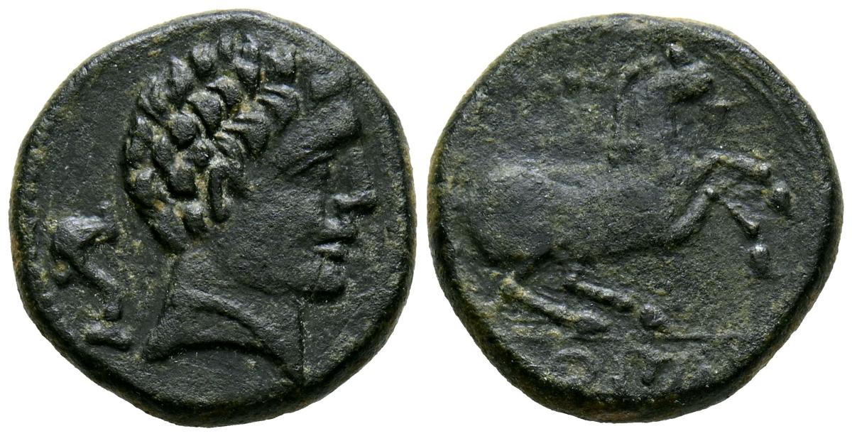 CONTERBIA CARBICA (Huete, Cuenca). Quadrant. (Ae. 3.80g/16mm). 120-80 Fine (FAB-860). Anv: Male head right, behind dolphin. Reverse: Horse right, above three dots, below Iberian legend below line: CaRBiCa. Good Very Fine/Very Fine.
