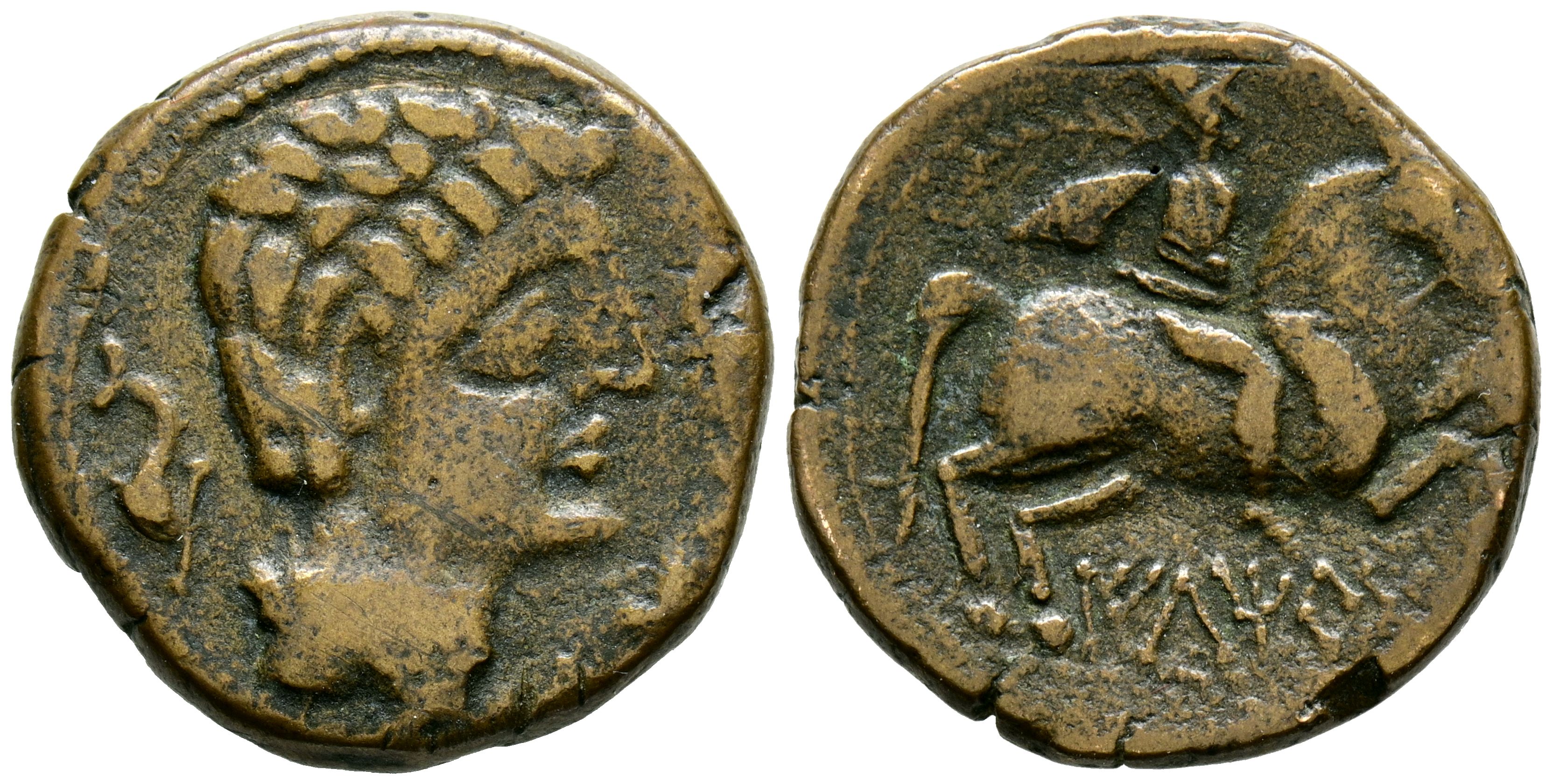 ILTIRTA (Lérida). As. (Ae. 8.48g/23mm). 200-20 Fine (FAB-1471). Anv: Male head right, around three dolphins. Reverse: Horseman with palm to the right, below Iberian legend: ILTiRTa. VF-.