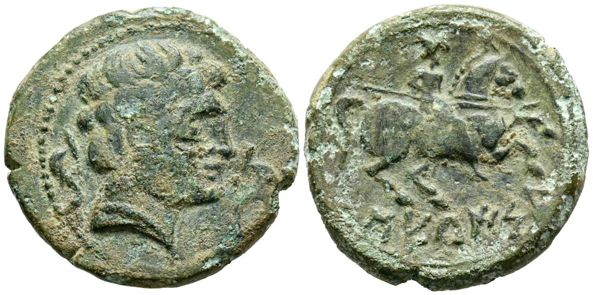 SECAISA (Segeda, Zaragoza). As. (Ae. 8.42g/25mm). 120-20 Fine (FAB-2137). Obv: Male head to the right, between two dolphins. Reverse: Horseman with lance to the right, below curved Iberian legend: SECaISA. VF.