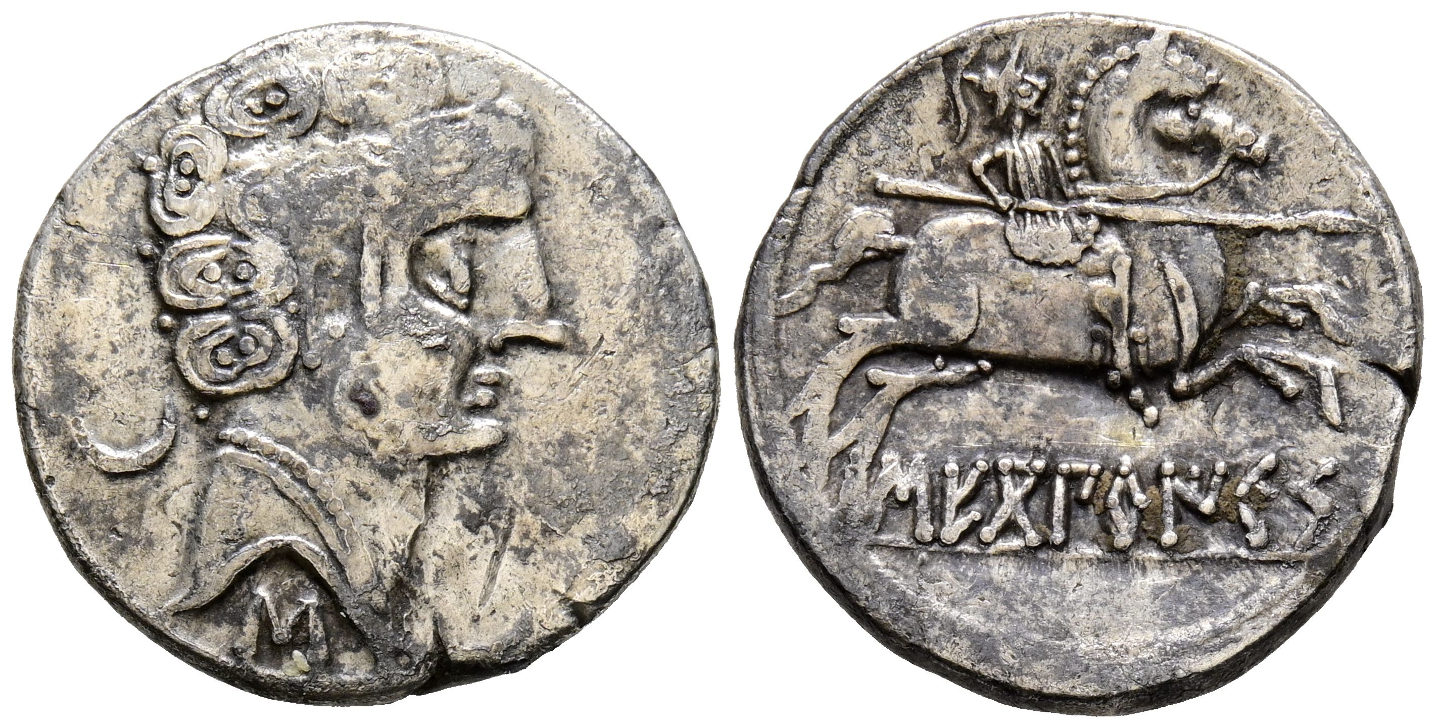 English SECOBIRICES (Saelices, Cuenca). Denarius. (Ar. 4.09g/20mm). 120-30 Fine (FAB-2169). Obv: Male head to right, crescent and dot behind, Iberian letter below: S. Rev: Horseman with lance to right, one foot sticking out. VF.