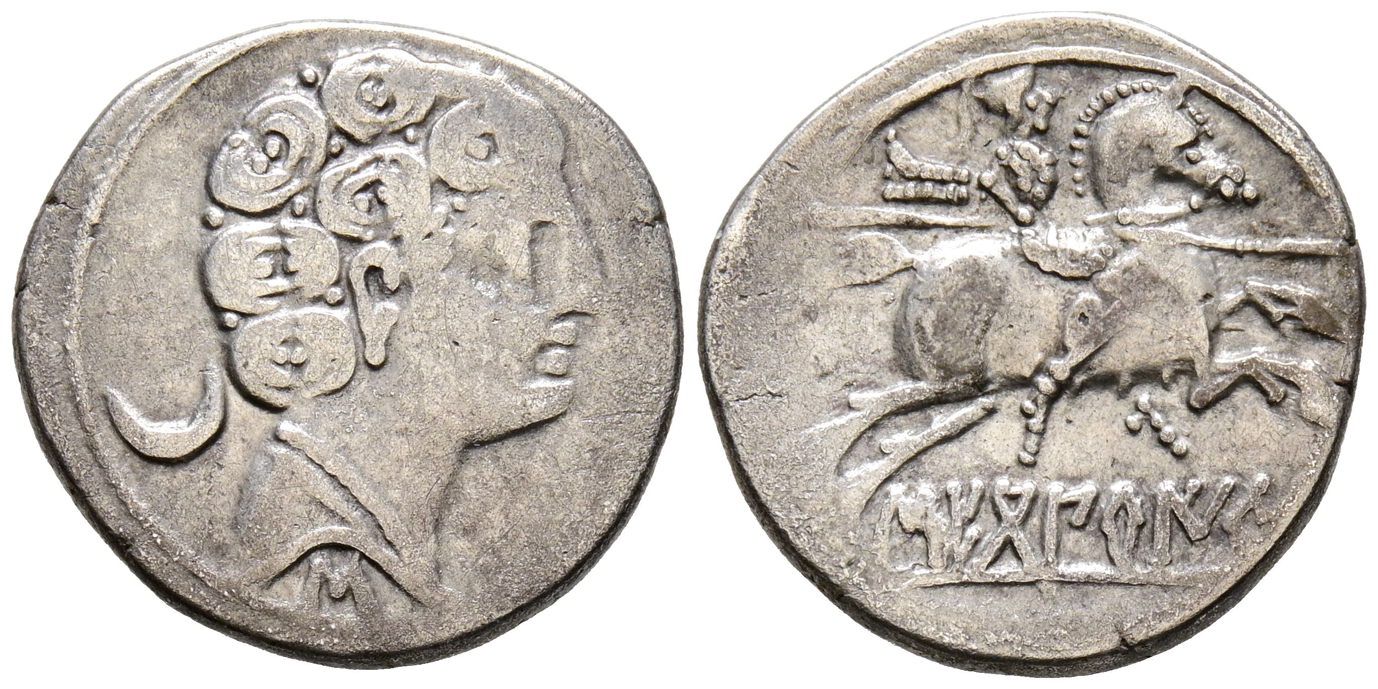 English SECOBIRICES (Saelices, Cuenca). Denarius. (Ar. 3.81g/19mm). 120-30 Fine (FAB-2174). Anv: Male head to right, crescent behind, below Iberian letter: S. Rev: Horseman with lance and cape to right, two feet sticking out, below Iberian legend above line: SeCoBiRICeS. Very Fine-/Very Fine.