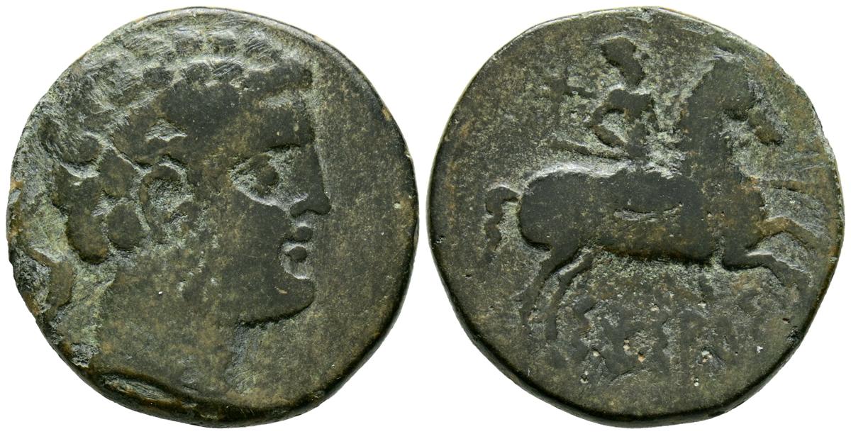 SESARS (Aragon area). As. (Ae. 8.81g/24mm). 120-20 Fine (FAB-2199). Anv: Bearded male head to right, behind a dolphin. Rev: Horseman with lance to right, star above, below Iberian legend: SESARS. VF-.