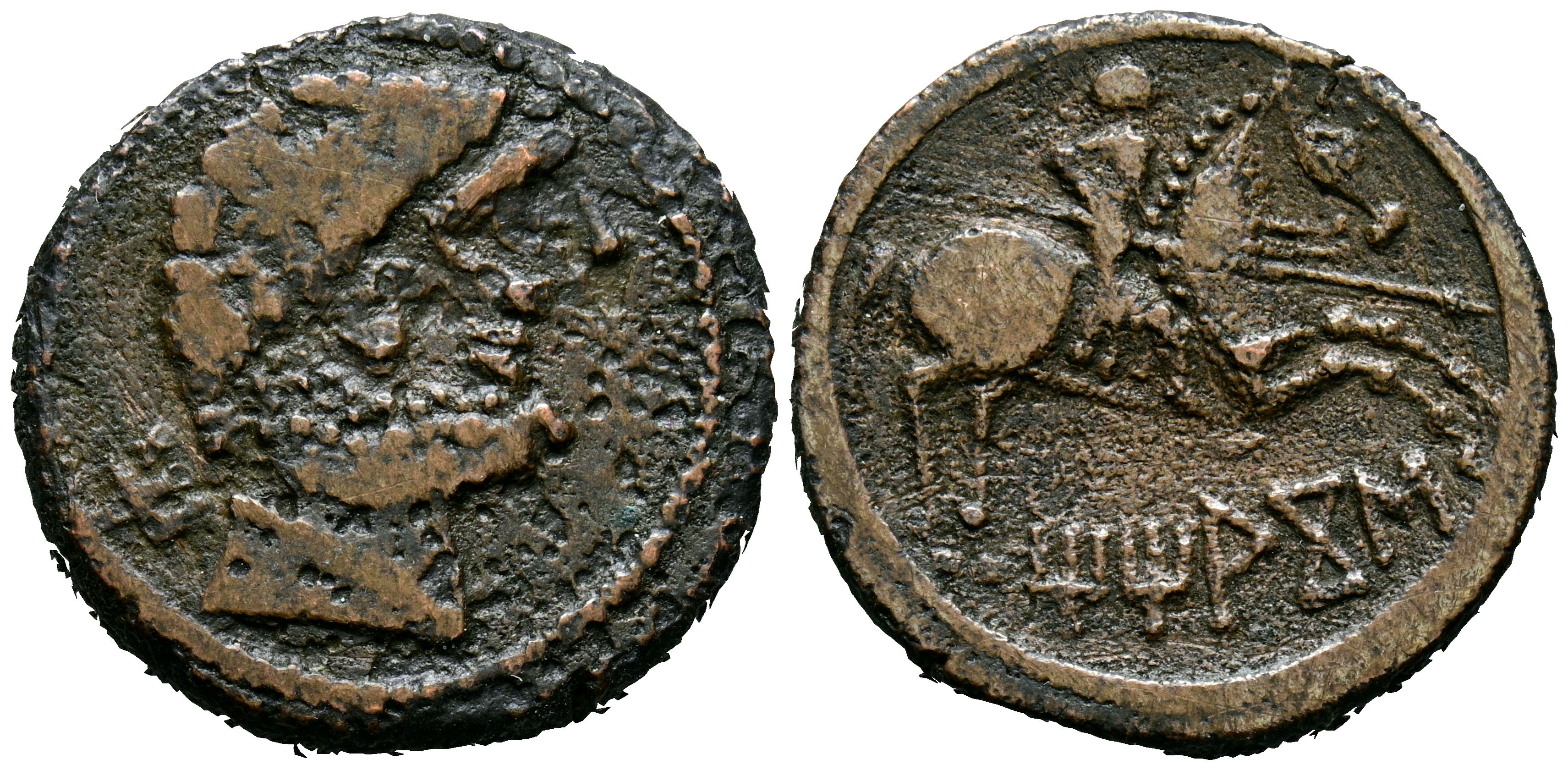 TITIACOS (Tricio, La Rioja). As. (Ae. 9.47g/24mm). 120-20 Fine (FAB-2394). Obv: Bearded male head facing right, behind Iberian letter: Ti. Rev: Horseman with lance facing right, below curved Iberian legend: TiTiACoS. VF. Cleaned.