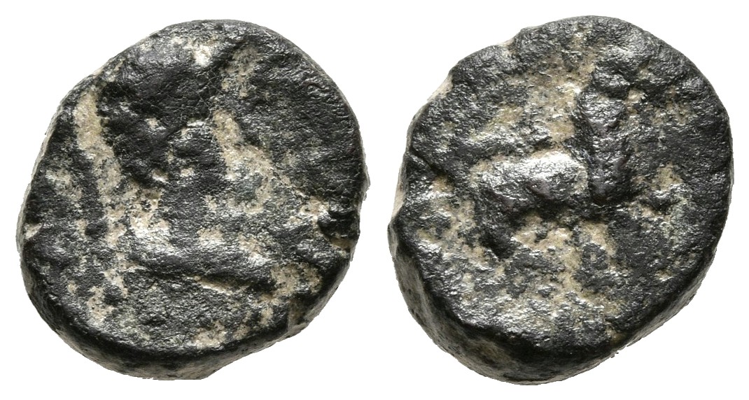 MASSALIA. AE, small bronze. 49 Fine Antipolis (Antibes) A/ Head of Minerva right, wearing Corinthian helmet, MAZ in front. R/ Lion right, legend above MAS and beads. LT 2110; MHM 81. Ae. 2.21g. VF-.