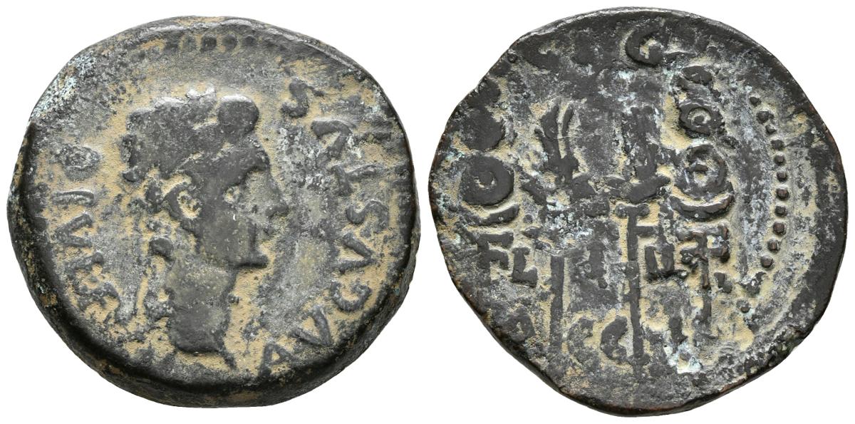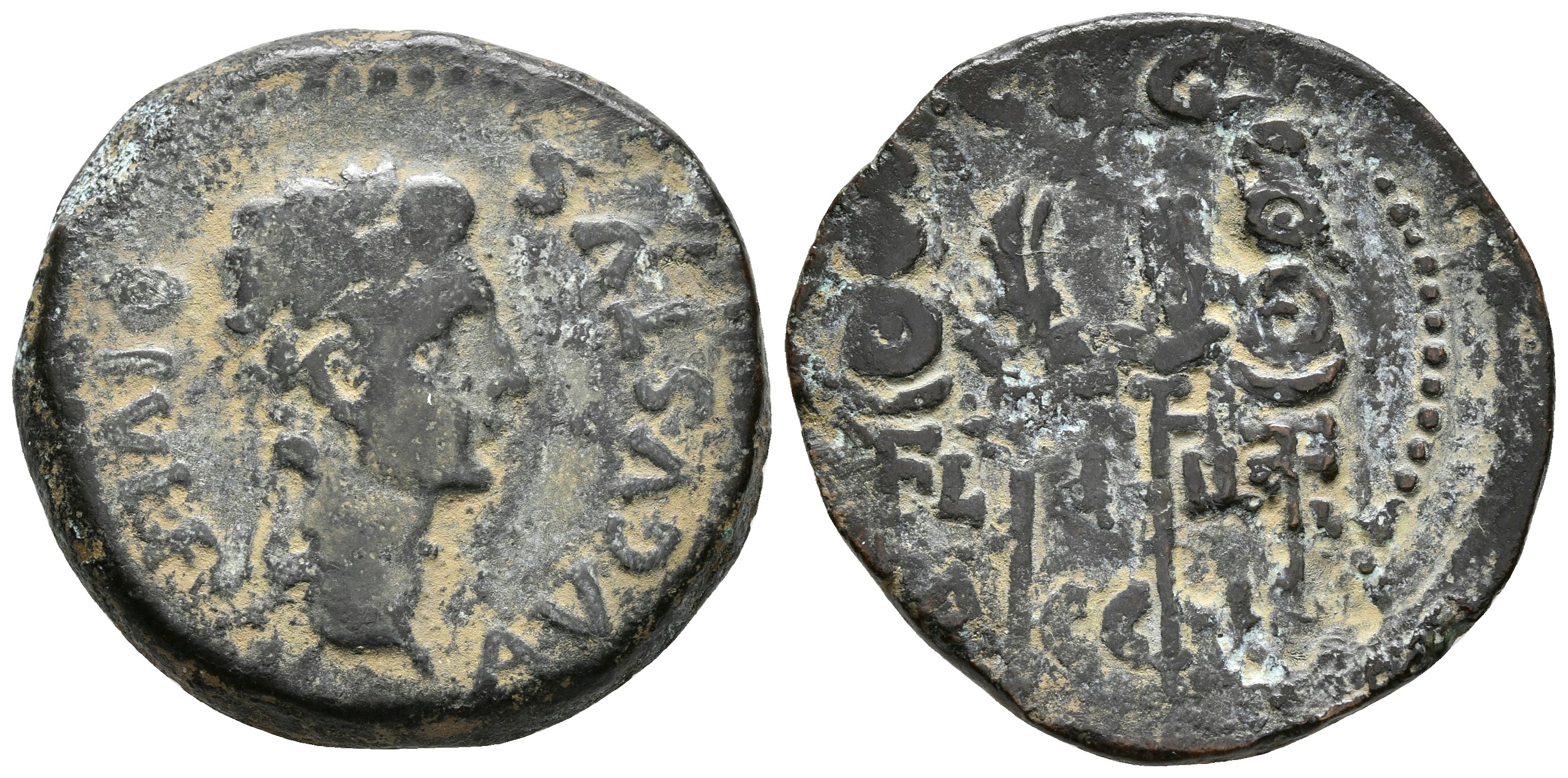 ACCI. As. 27 BC-AD 14 Guadix (Granada). A / AVGVSTVS DIVI F. Laureate head of Augustus on the right. R / CIGLIII (ACCI). Legionary eagles and insignia. FAB-34. Ae. 14.53g. Very Fine. Limited.