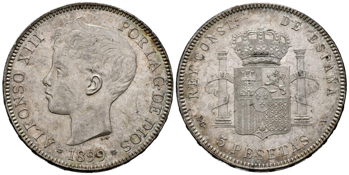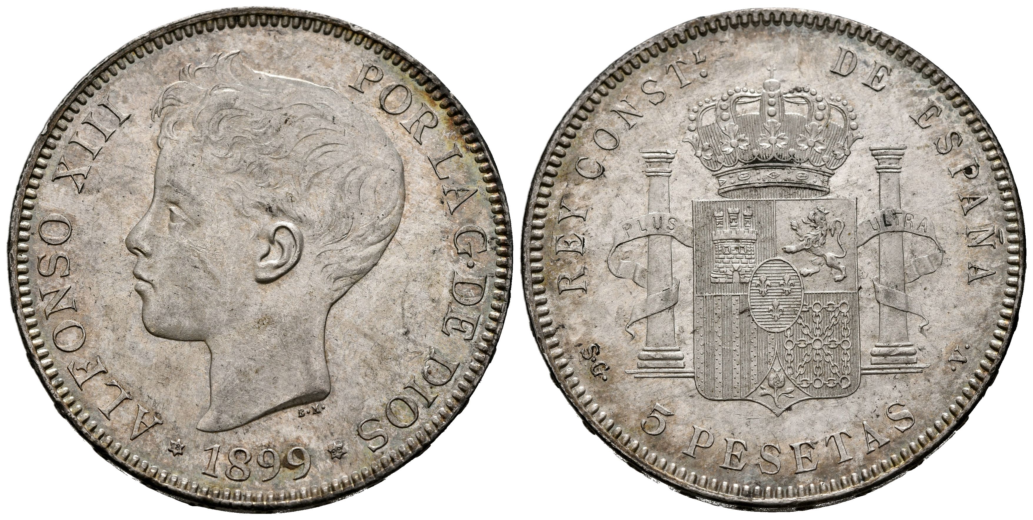 English ALFONSO XIII (1885-1931). 5 Pesetas. (Ar. 24.95g/37mm). 1899 *18-99. Madrid SGV. (Cal-2019-110). Good Extremely Fine.
