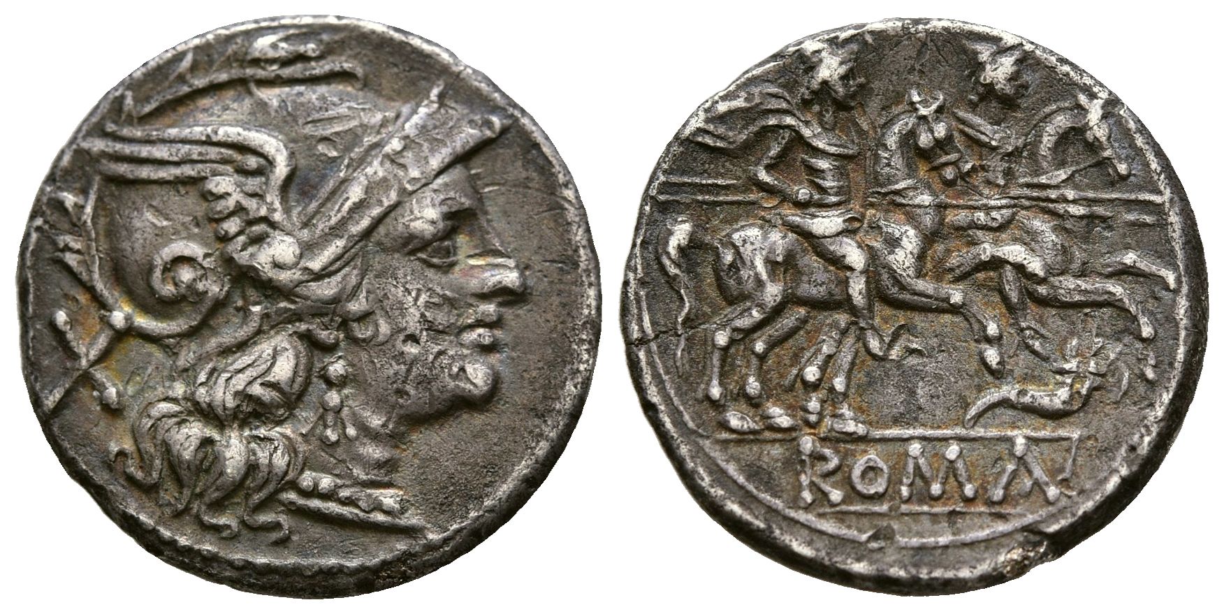 English ANONYMOUS. Denarius. (Ar. 4.08g/18mm). 208-206 BC Rome. (Crawford 58/2; FFC 27). Obv: Head of Rome to the right, behind X. Rev: Dioscuri on horseback to the right, stars above, cornucopia below, legend: ROME below. Very Fine.