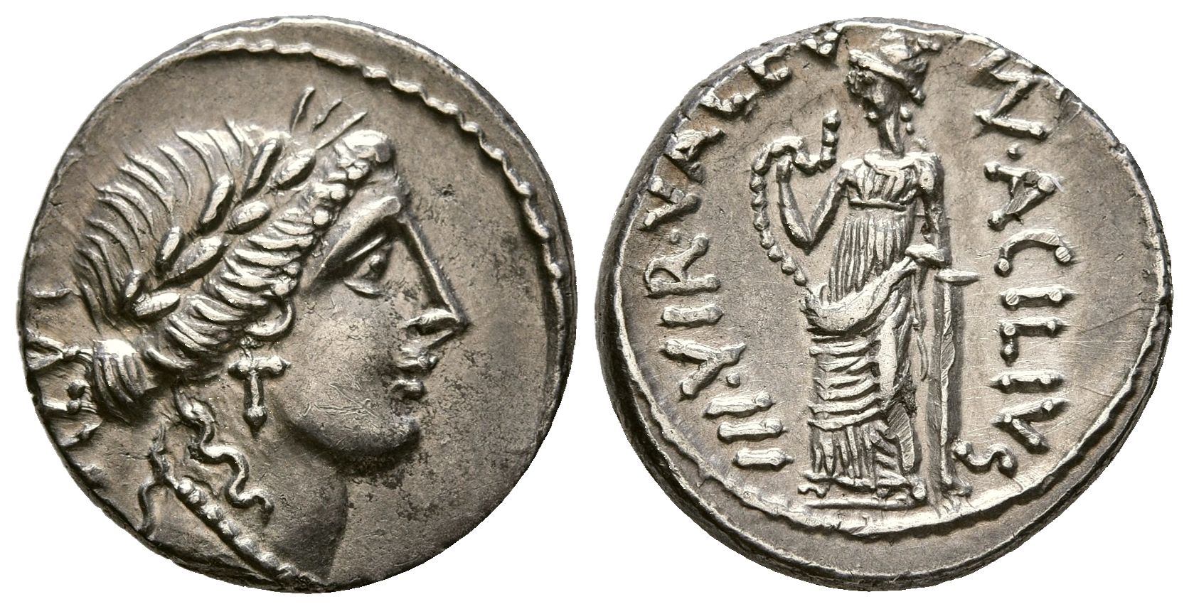 English GENS ACILIA. Denarius. (Ar. 3.90g/17mm). 55 BC Rome. (Crawford 442/1a; FFC 96). Obv: Laureate head of Salus to the right, behind legend: SALVTIS. Rev: Salus standing to left resting on column and serpent, around legend: MN ACILIVS III VIR VALETV. Good Extremely Fine. Slight original shine. Nice specimen, scarce like that.