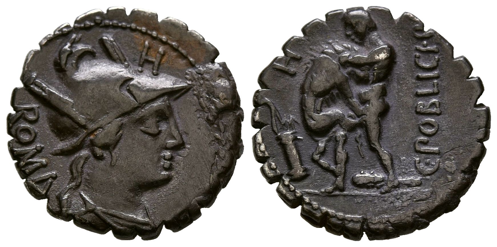 PUBLIC GENE. Denarius. (Ar. 3.73g/18mm). 80 BC Auxiliary workshop in Rome. (Crawford 380/1; FFC 1017). Obv: Head of Rome to right, above: H, behind legend: ROMA. Rev: Hercules standing to left strangling the Nemean lion, in front: mallet, bow and quiver, above: H, behind legend: C POBLICI Q F. Good Very Fine. Dark patina.