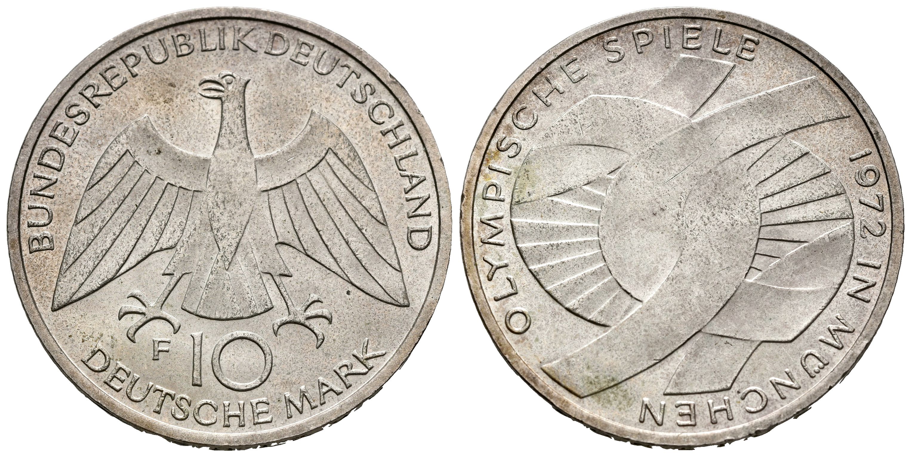 English GERMANY. 10 Mark (Ar. 15.55g/33mm). 1972. Stuttgart F. Munich Olympic Games. Knot. (Km#131). VF-.