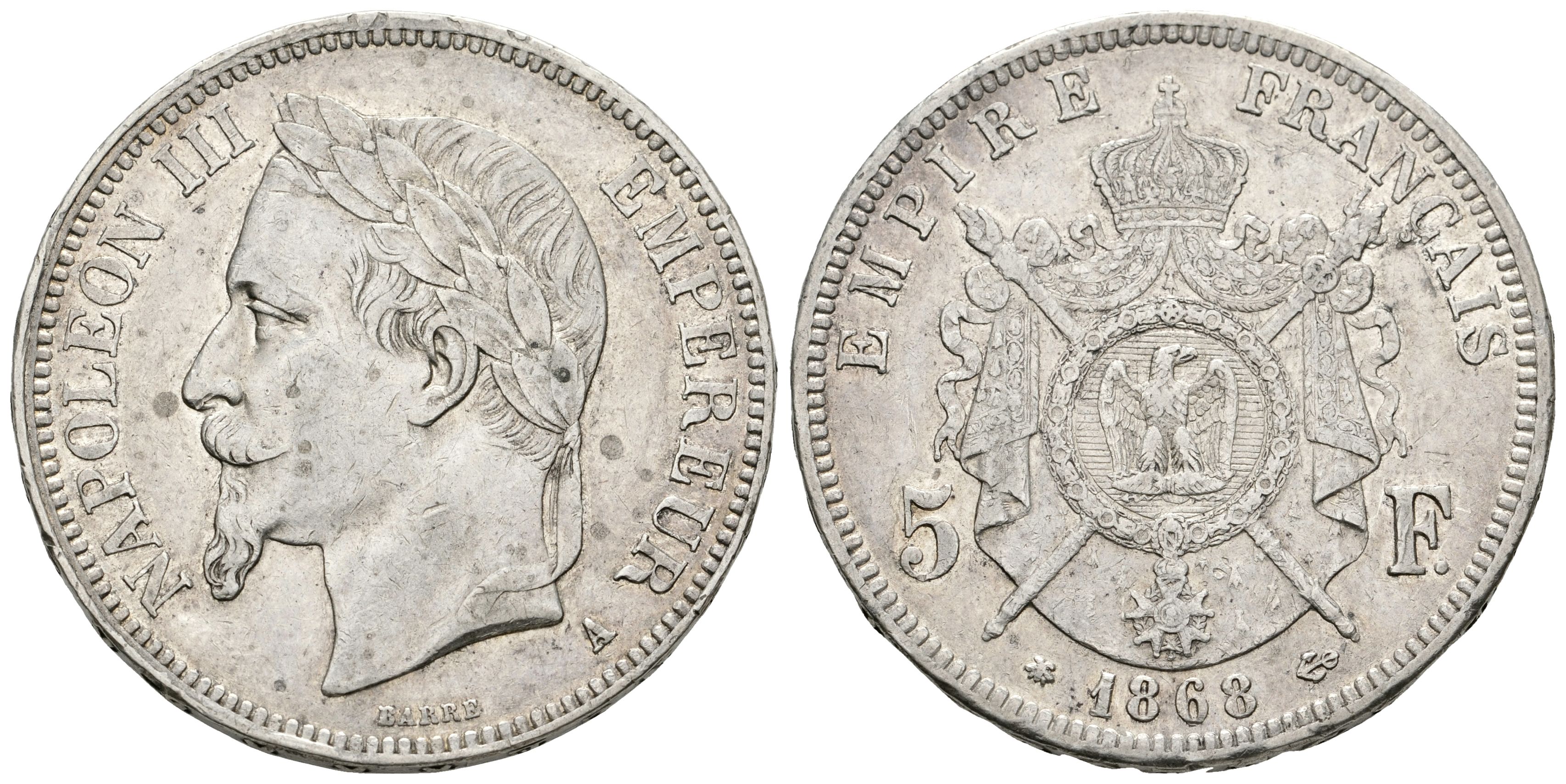 FRANCE. Napoleon III. 5 Francs. 1868. Paris A. Km#799.1. Ar. 24.88g. Very Fine.