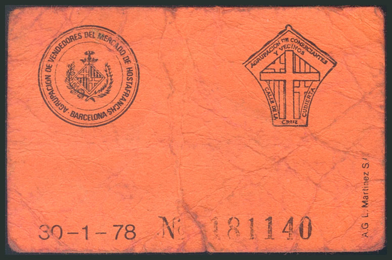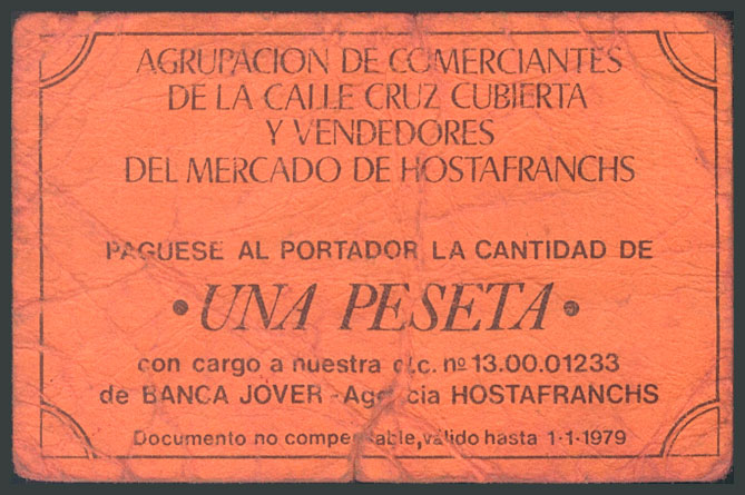 BARCELONA (1978). 1 Peseta Voucher from the Merchants Group of the Hostafranchs Market. Very Fine.