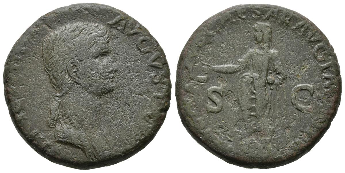 ANTONIA. Dupondio. 66 AD Rome. A / Bust draped to the right. ANTONIA AVGVSTA. R / Claudio velado left shelf bearing symbol. TI CLAVDIVS CAESAR AVG PM TR P IMP, in exergue S C. RIC 92 (Claudius). Ae. 11.72g. BC +. Former Numismatik Naumann 68.